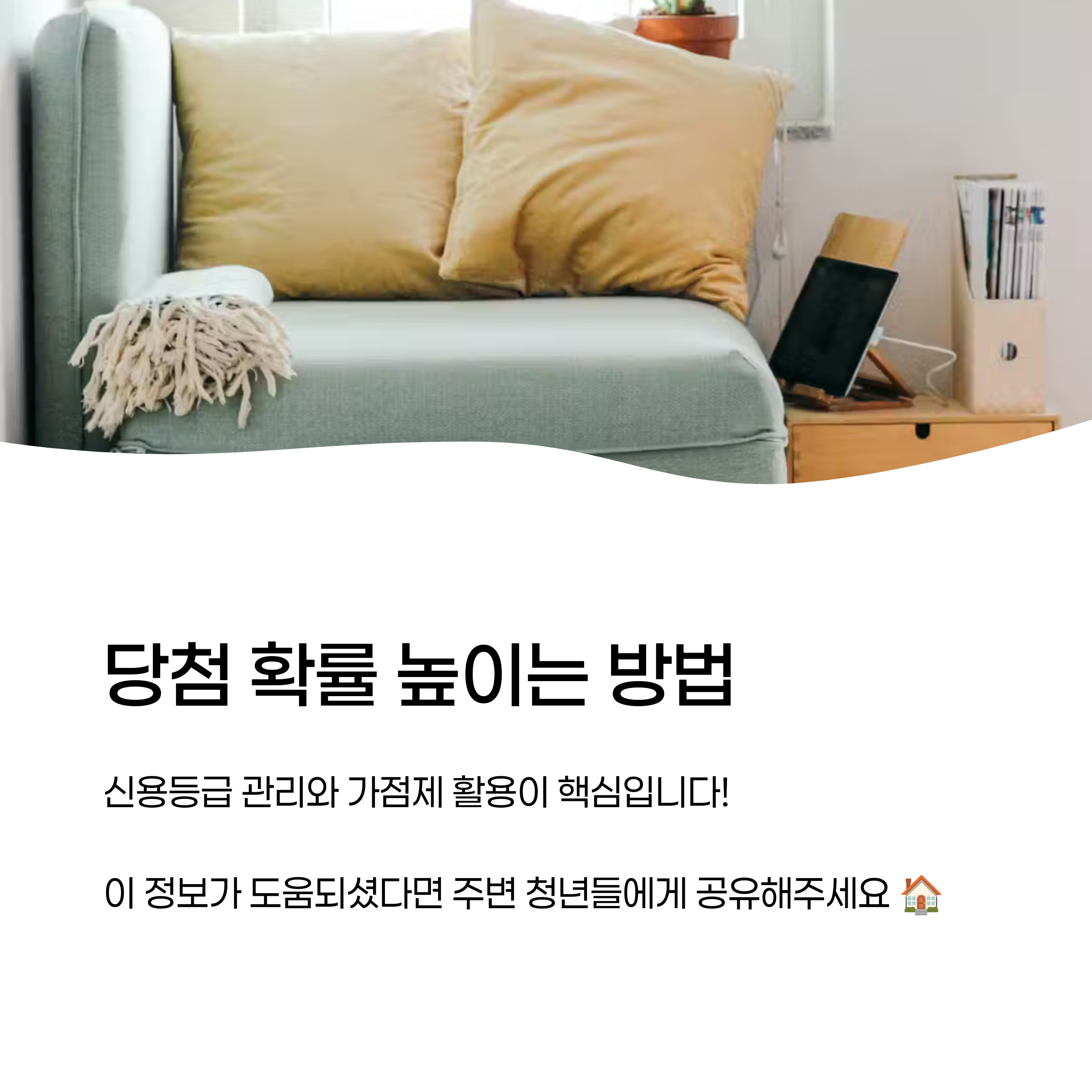 예를 들어, 동일한 조건이라도 가점제 요소인 소득 수준, 무주택 기간, 세대주 여부, 부양가족 수 등이 높으면 당첨 가능성이 확실히 올라가요. 청년이더라도 독립 세대를 구성해 세대주가 되면 가점에서 유리해요.