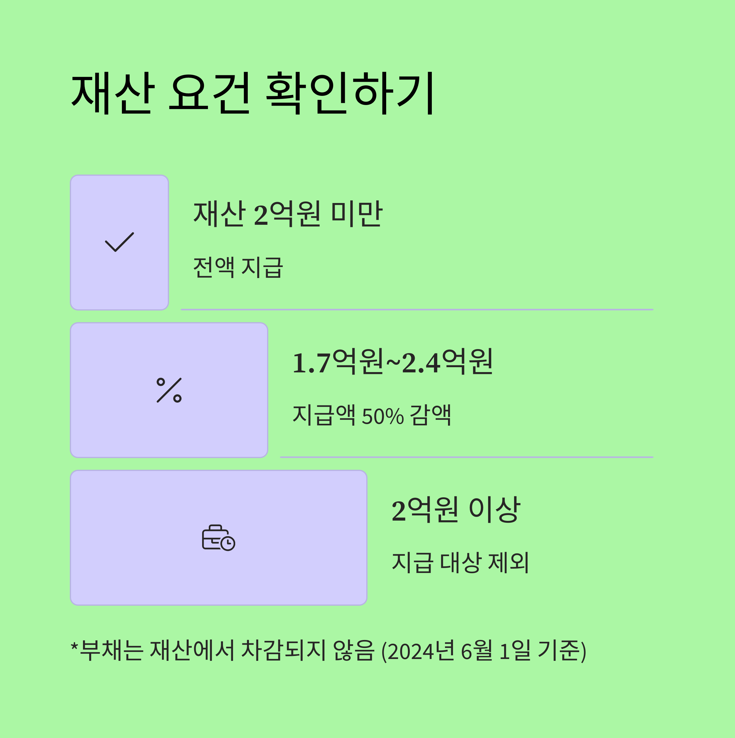 그리고 재산 기준도 꼭 봐야 해요. 2024년 6월 1일 기준으로 가구원 전체의 재산 합계가 2억 4천만 원 미만이어야 해요. 여기서 재산은 부동산, 자동차, 금융자산, 전세보증금 등이 모두 포함돼요. 만약 재산이 1억 4천만 원을 넘으면 지급액이 감액될 수 있어요.