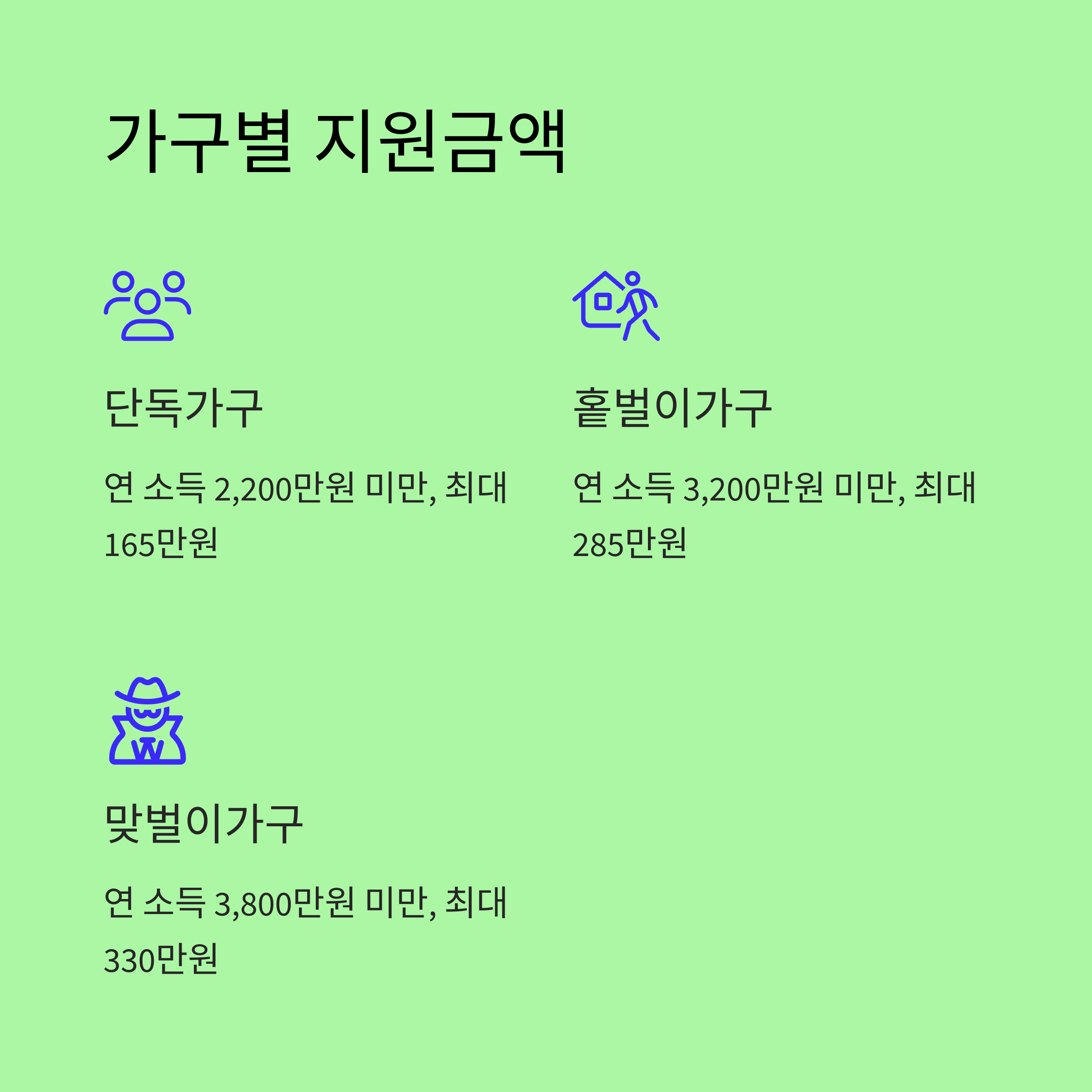 이제 자격이 되는지 어느 정도 감이 오셨을 거예요 😊 이어서 “가구별 소득 조건과 지원금액”에 대해 자세히 알아볼게요!