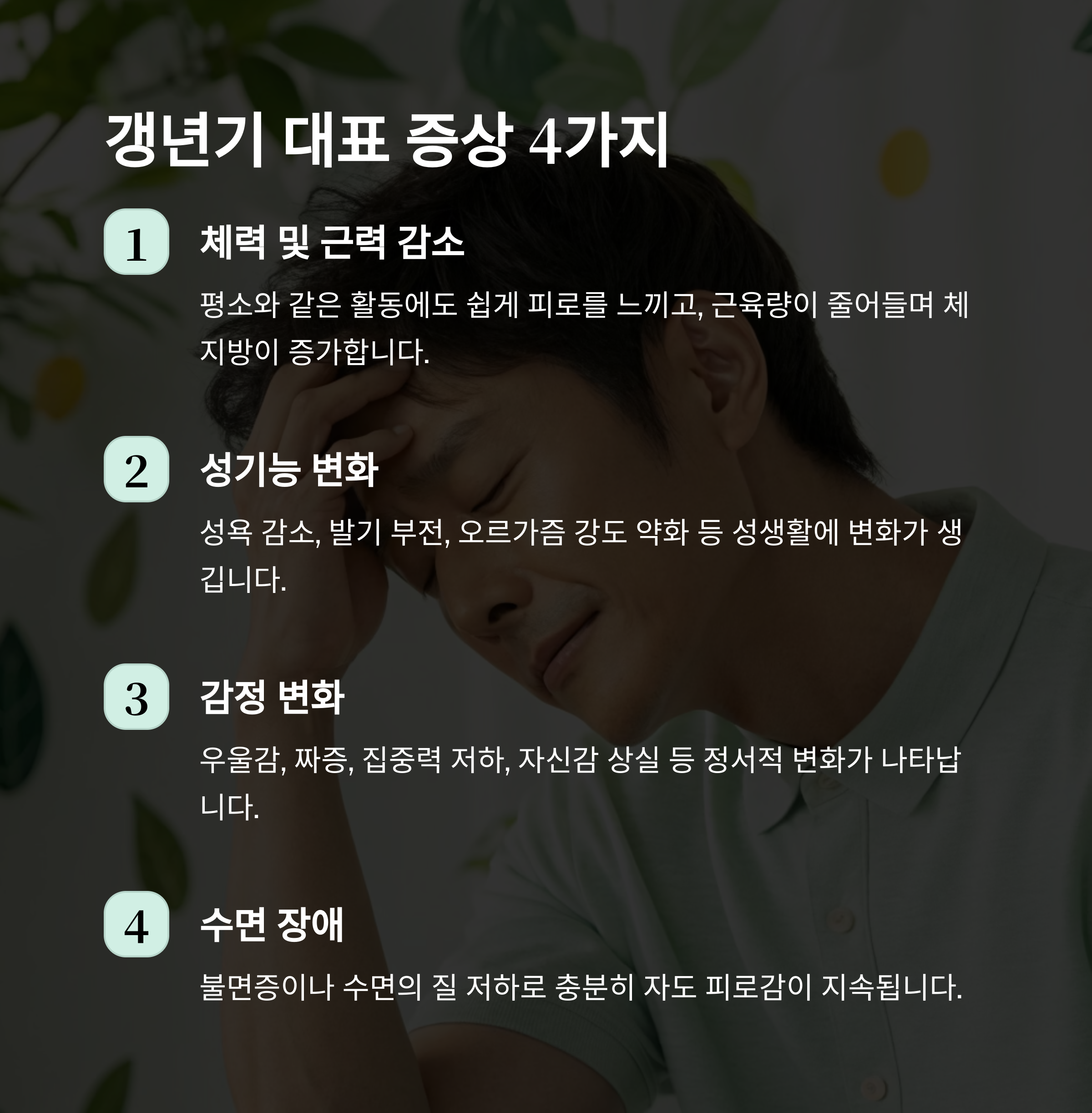 남성 갱년기는 다양한 증상으로 나타나기 때문에 단순히 피곤하다는 이유로 넘기면 안 돼요. 대표적인 증상으로는 만성 피로, 우울감, 집중력 저하, 성욕 감퇴, 체지방 증가 등이 있어요. 특히 정신적인 변화가 심리적으로 더 큰 영향을 줄 수 있어요.
