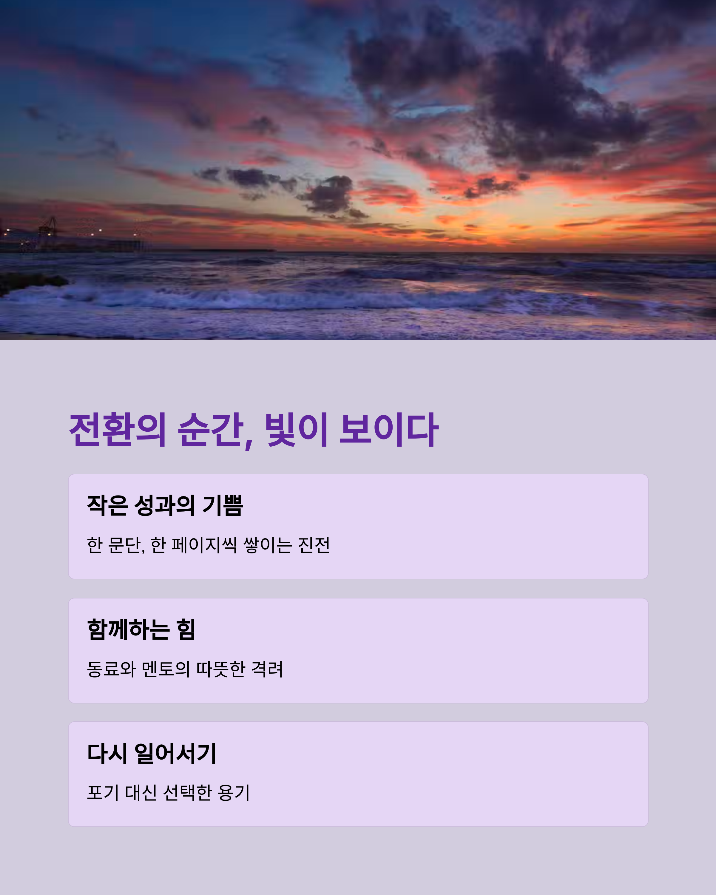 나는 그날 이후로 생각보다 쉽게 글의 단어들을 이어나갈 수 있었어요. 완벽한 문장을 기대하기보다는, 그때의 감정을 있는 그대로 풀어내는 연습을 시작했어요. 작은 성공들이 모여 결국 큰 전환점을 만들어 내는 경험을 하게 되었어요. 어려움 속에서 한 줄 한 줄 내딛는 용기가 결국은 새로운 길을 열어준 순간이었어요.
