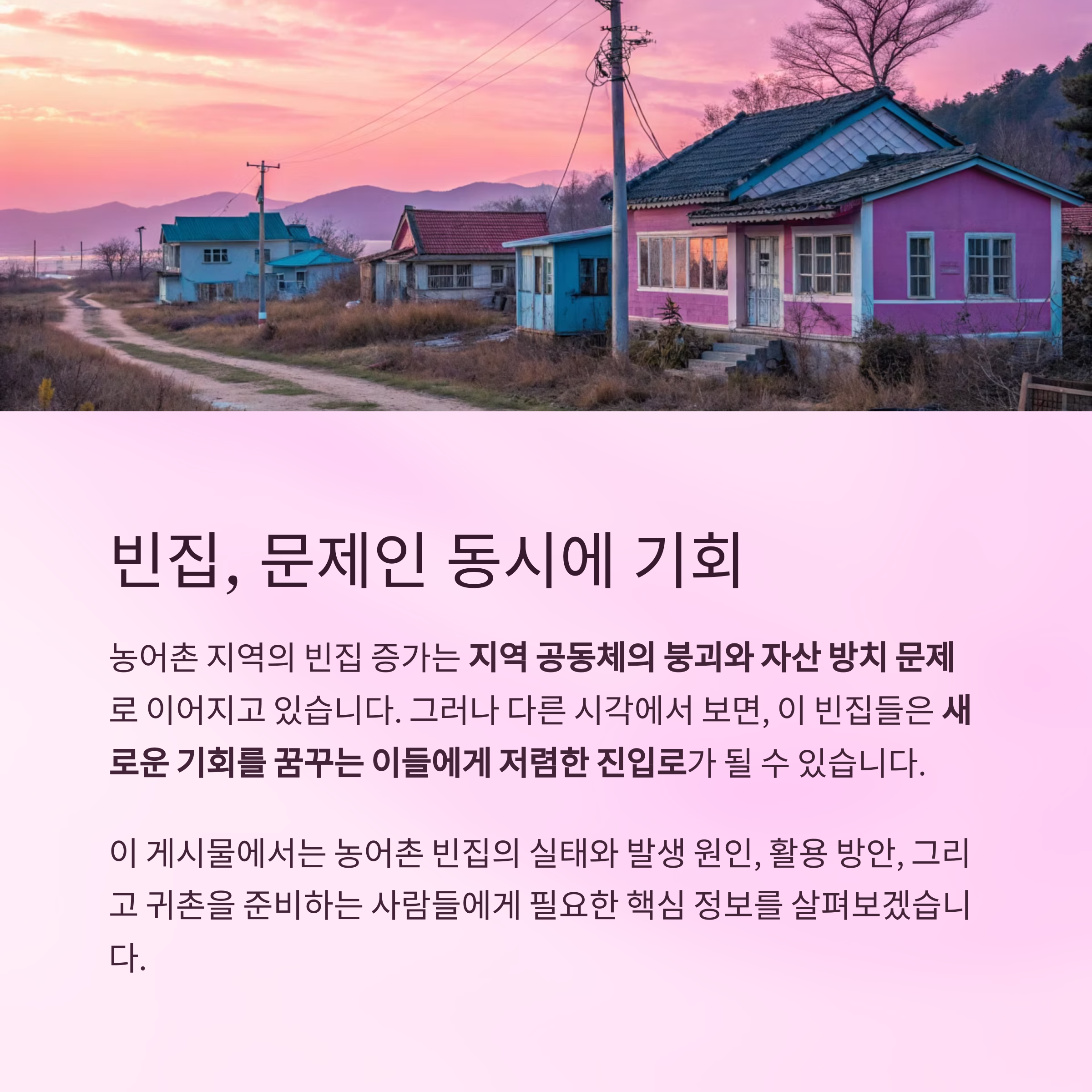 농어촌 지역의 빈집 증가는 단순한 인구 감소의 결과를 넘어서 지역 공동체의 붕괴와 자산 방치 문제로 연결되고 있습니다. 그러나 반대로 보면, 이 빈집은 새로운 기회를 꿈꾸는 이들에게 저렴한 진입로가 될 수 있습니다. 본 글에서는 농어촌 빈집의 실태와 발생 원인, 활용 방안, 그리고 귀촌을 준비하는 사람들에게 필요한 핵심 정보를 정리해보겠습니다.