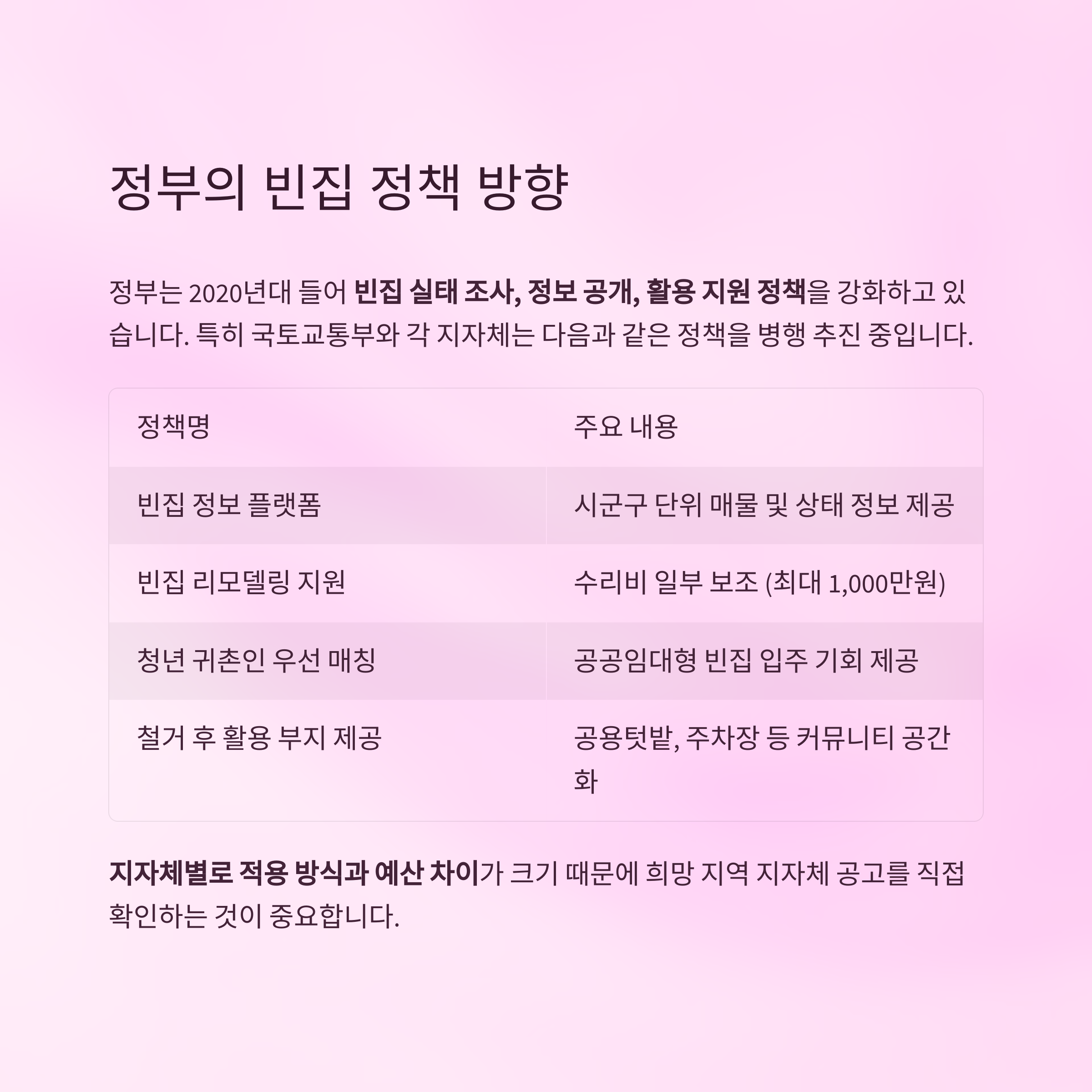 정부는 2020년대 들어 빈집 실태 조사, 정보 공개, 활용 지원 정책을 강화하고 있습니다.