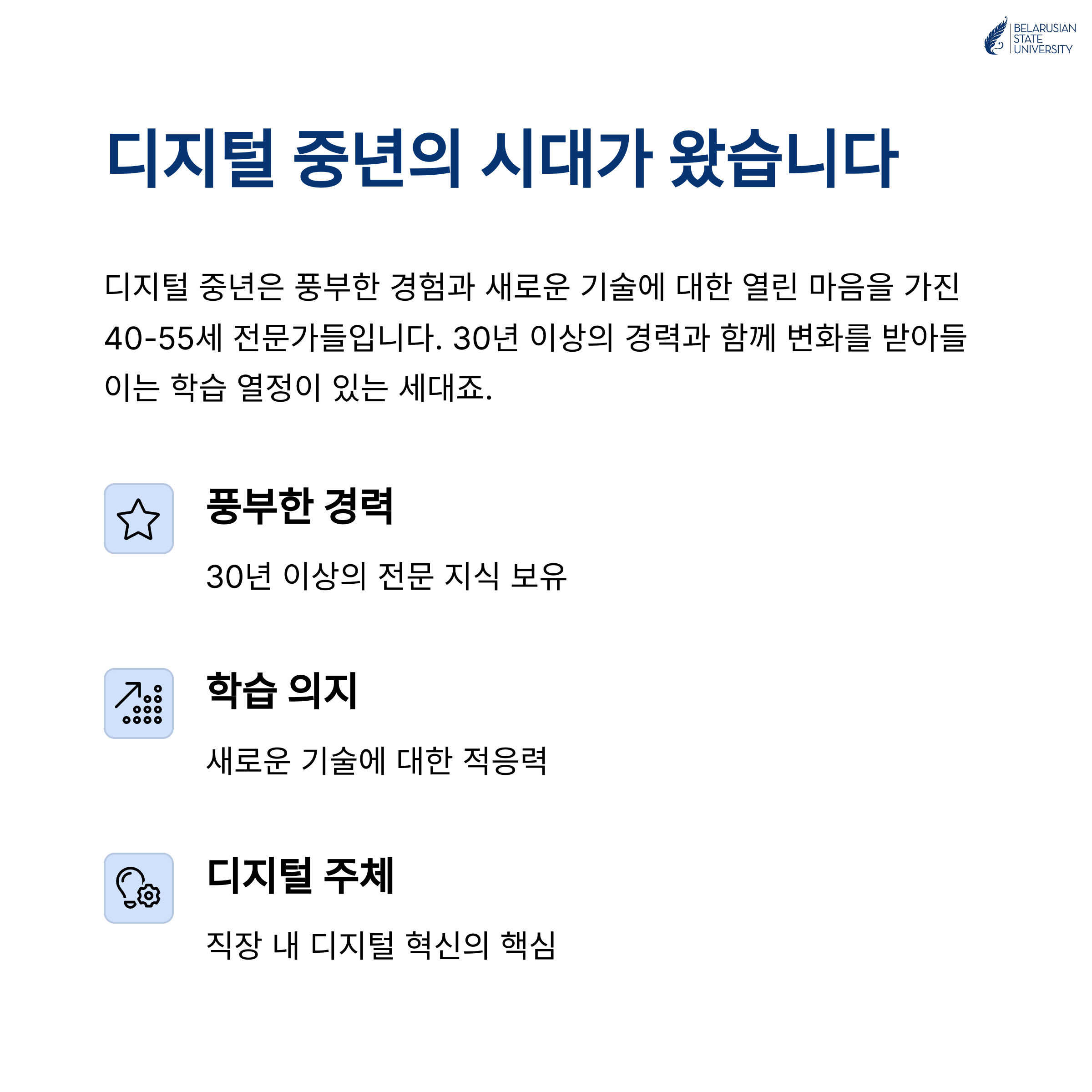 디지털 중년은 40~60대 사이의 세대로, 디지털 환경에 적응 중인 세대를 뜻해요. 이 세대는 아날로그와 디지털을 모두 경험했기 때문에, 적응만 하면 누구보다 유연하게 기술을 활용할 수 있죠.
