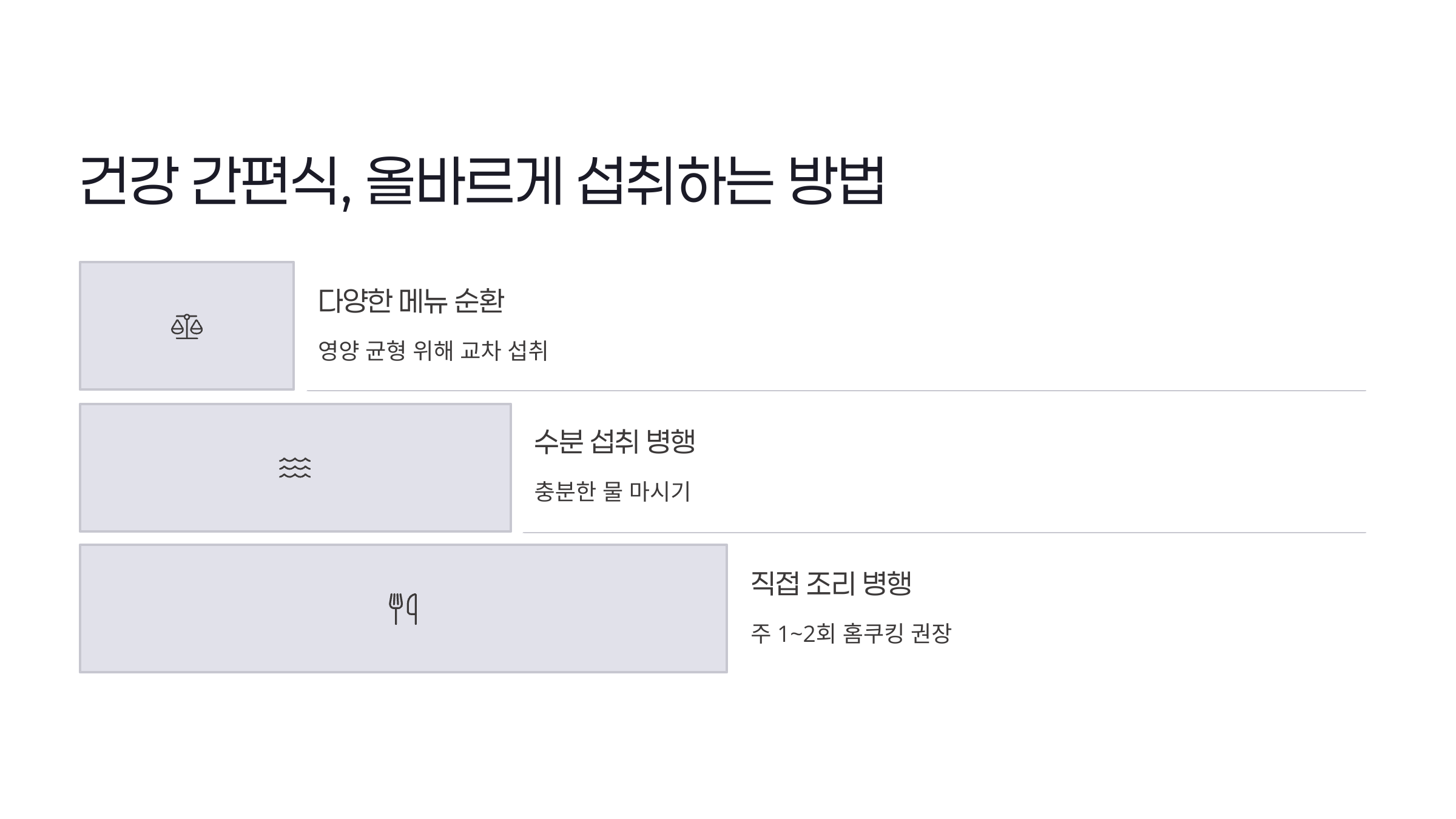 - 간편식만으로 끼니를 해결하지 않고, 신선한 과일이나 채소를 추가하세요.