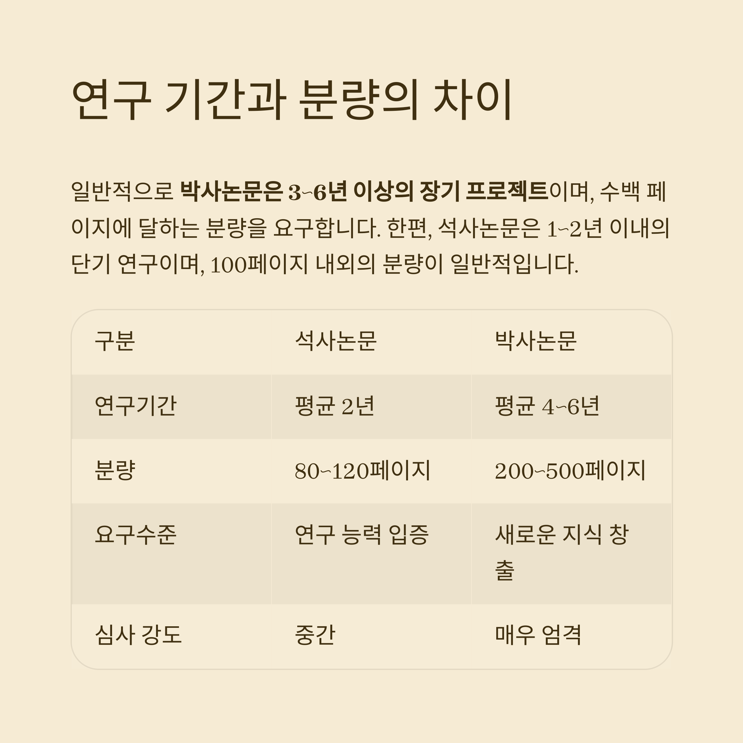 일반적으로 박사논문은 3~6년 이상의 장기 프로젝트이며, 수백 페이지에 달하는 분량을 요구합니다.