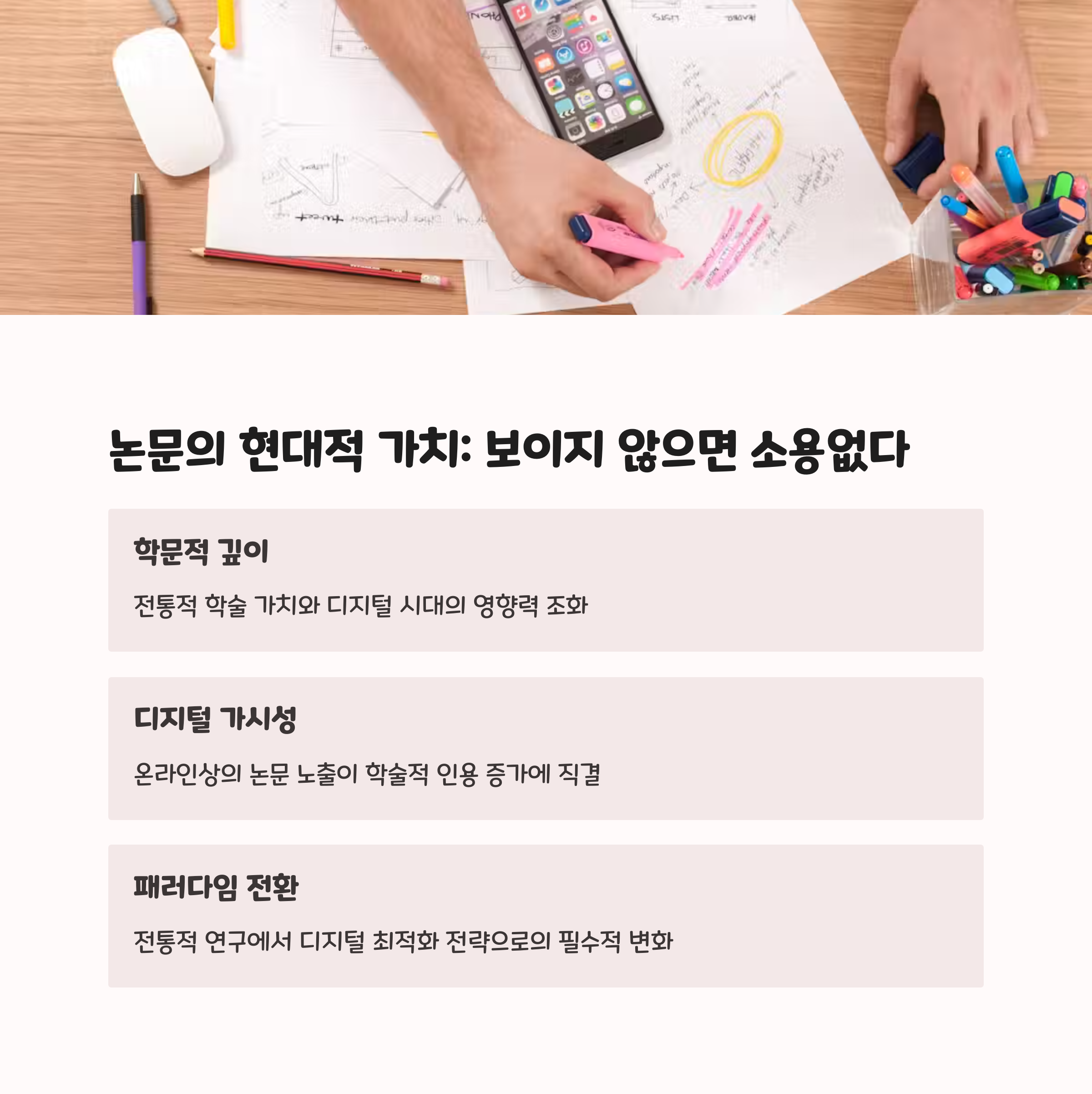 박사 논문은 더 이상 ‘출간용 서랍 속 연구’가 아니라, 실시간으로 공유되고 인용되는 ‘디지털 콘텐츠’가 되었어요. 이 때문에 학술 검색엔진에서 잘 노출되기 위한 전략이 정말 중요해졌답니다.