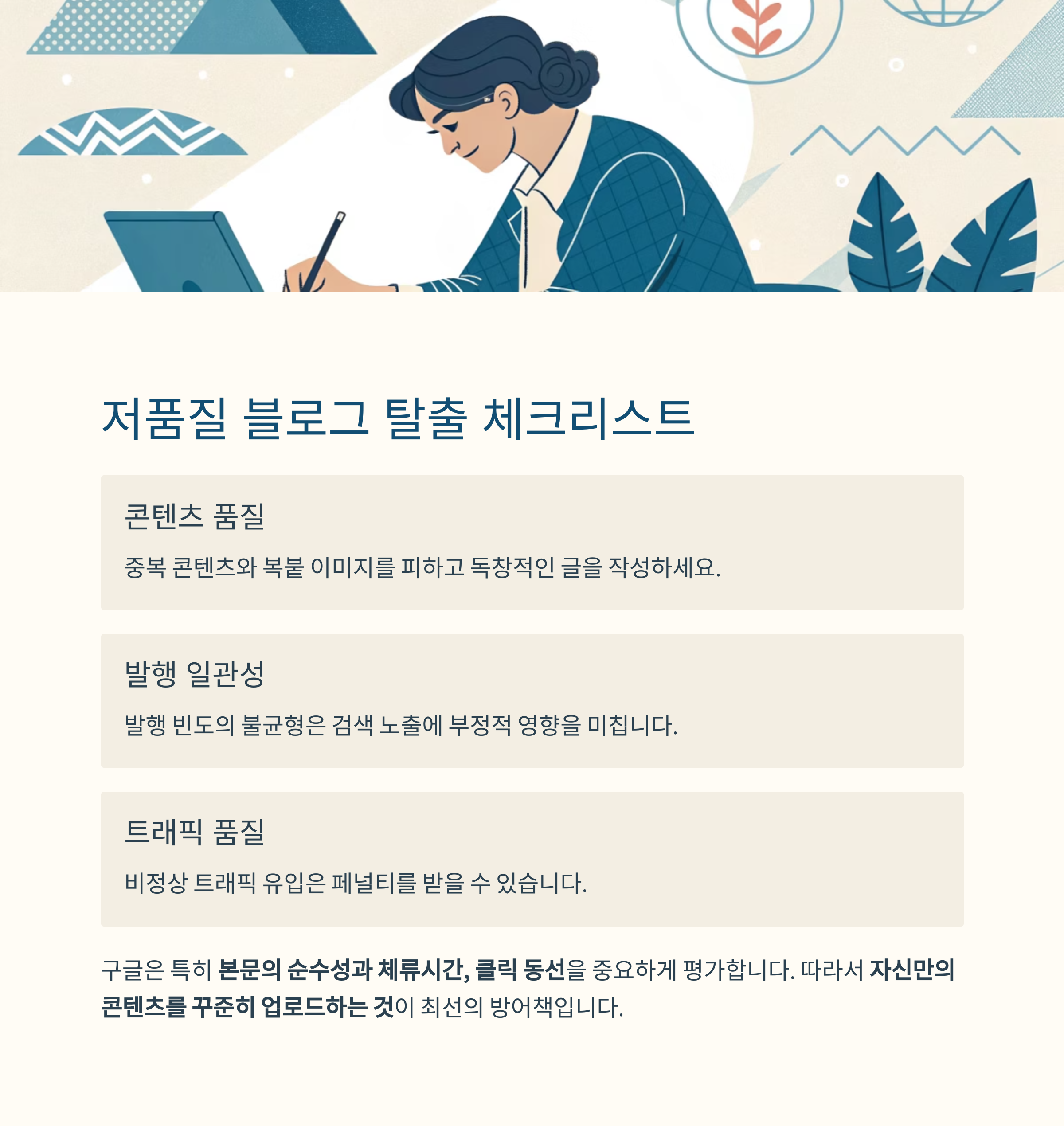 "중복 콘텐츠, 발행 빈도 불균형, 비정상 트래픽 유입, 복붙 이미지"