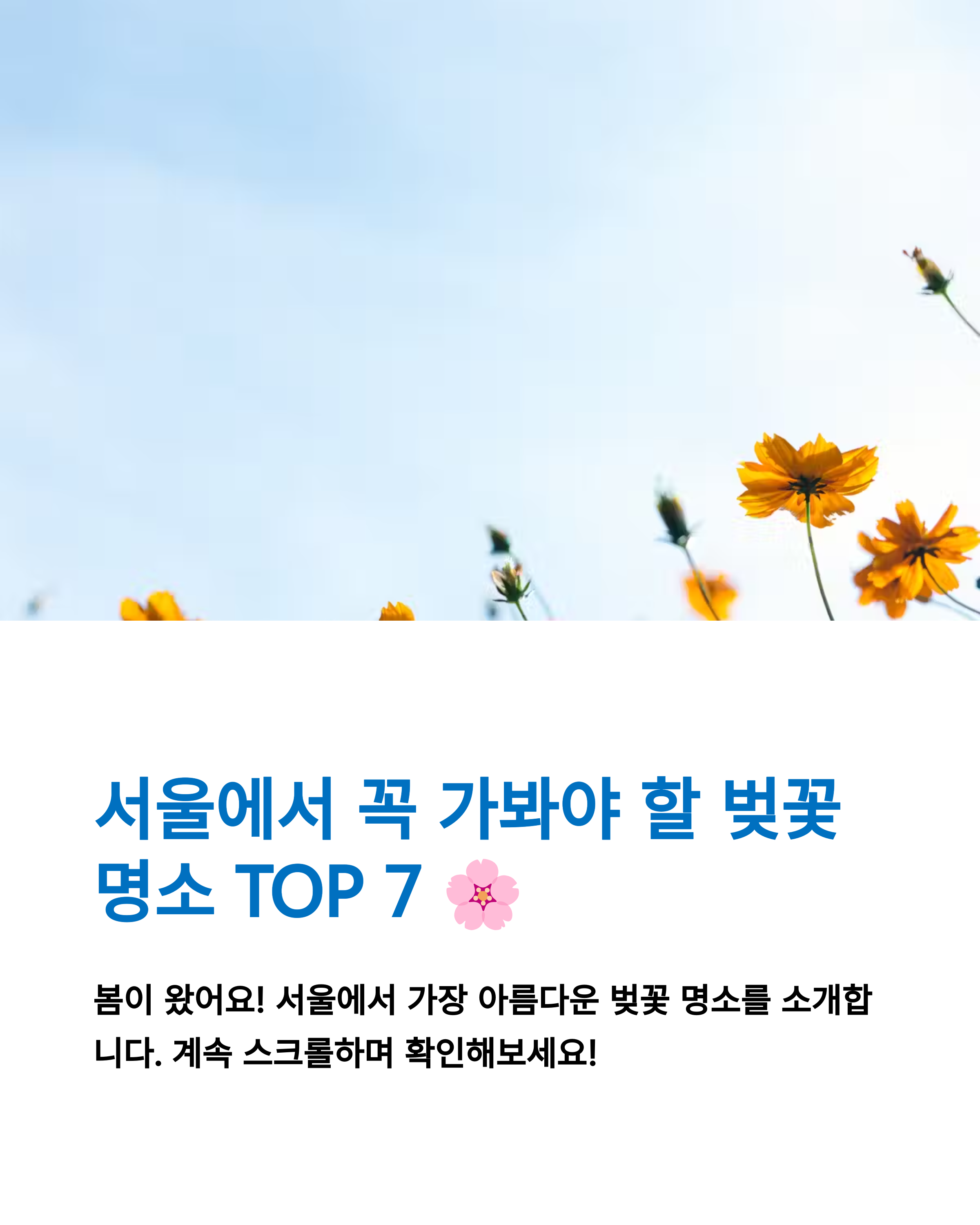 그럼 지금부터 서울에서 꼭 가봐야 할 벚꽃 명소 7곳! 시작해볼게요 🌸