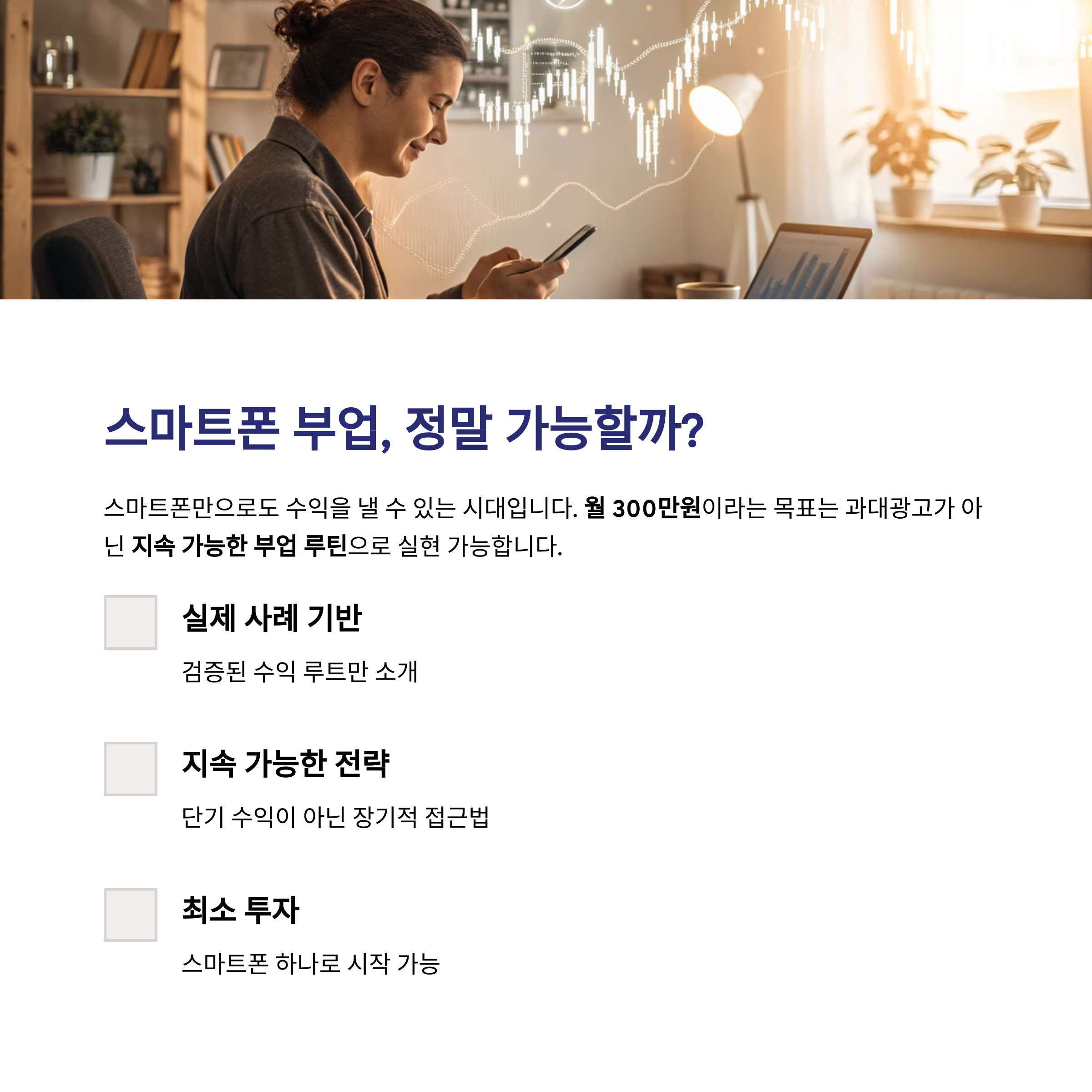 스마트폰만으로도 수익을 낼 수 있는 시대입니다. 하지만 "월 300만원"이라는 목표는 현실적일까요? 본 글에서는 과대광고가 아닌, 실제 가능한 수익 루트들을 정리하였습니다. 단순한 클릭 유도형이 아닌 지속 가능한 부업 루틴, 그리고 실제로 수익을 창출하는 사람들이 집중하는 영역을 소개합니다.