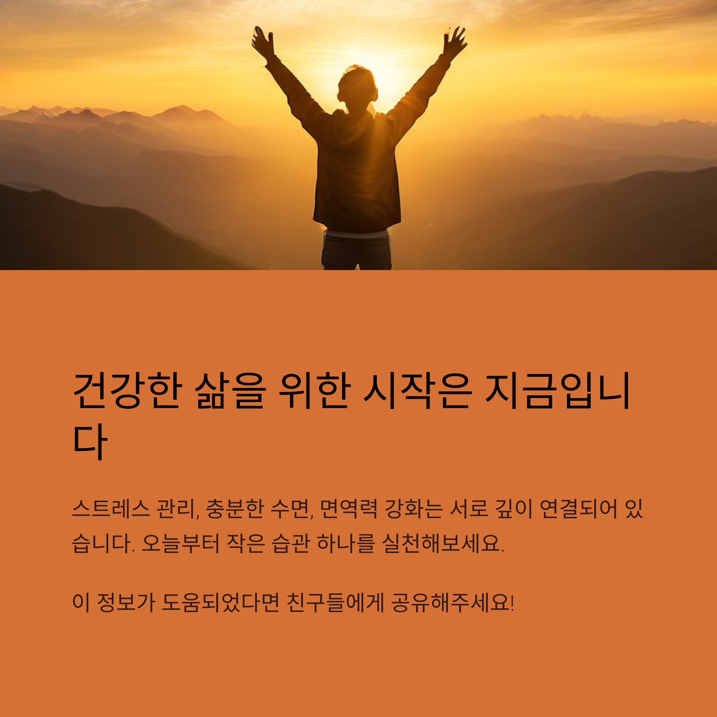 건강한 삶을 유지하려면 스트레스를 효과적으로 관리하고, 양질의 수면을 취하며, 면역력을 강화하는 생활 습관을 갖는 것이 중요하다. 작은 변화가 쌓이면 우리의 삶의 질이 더욱 향상될 수 있다.