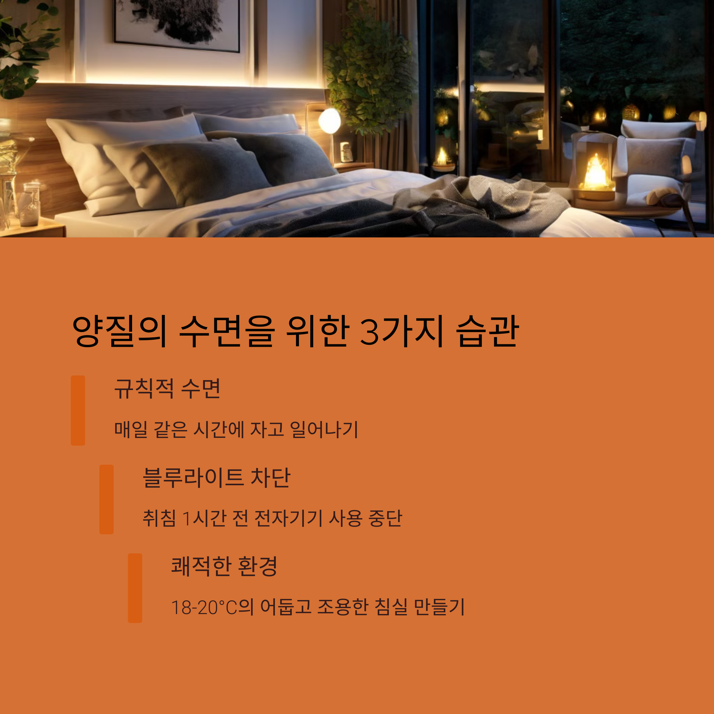 - 침실 환경 개선: 어둡고 조용한 환경을 조성하고, 침구를 편안하게 유지하는 것이 중요하다.