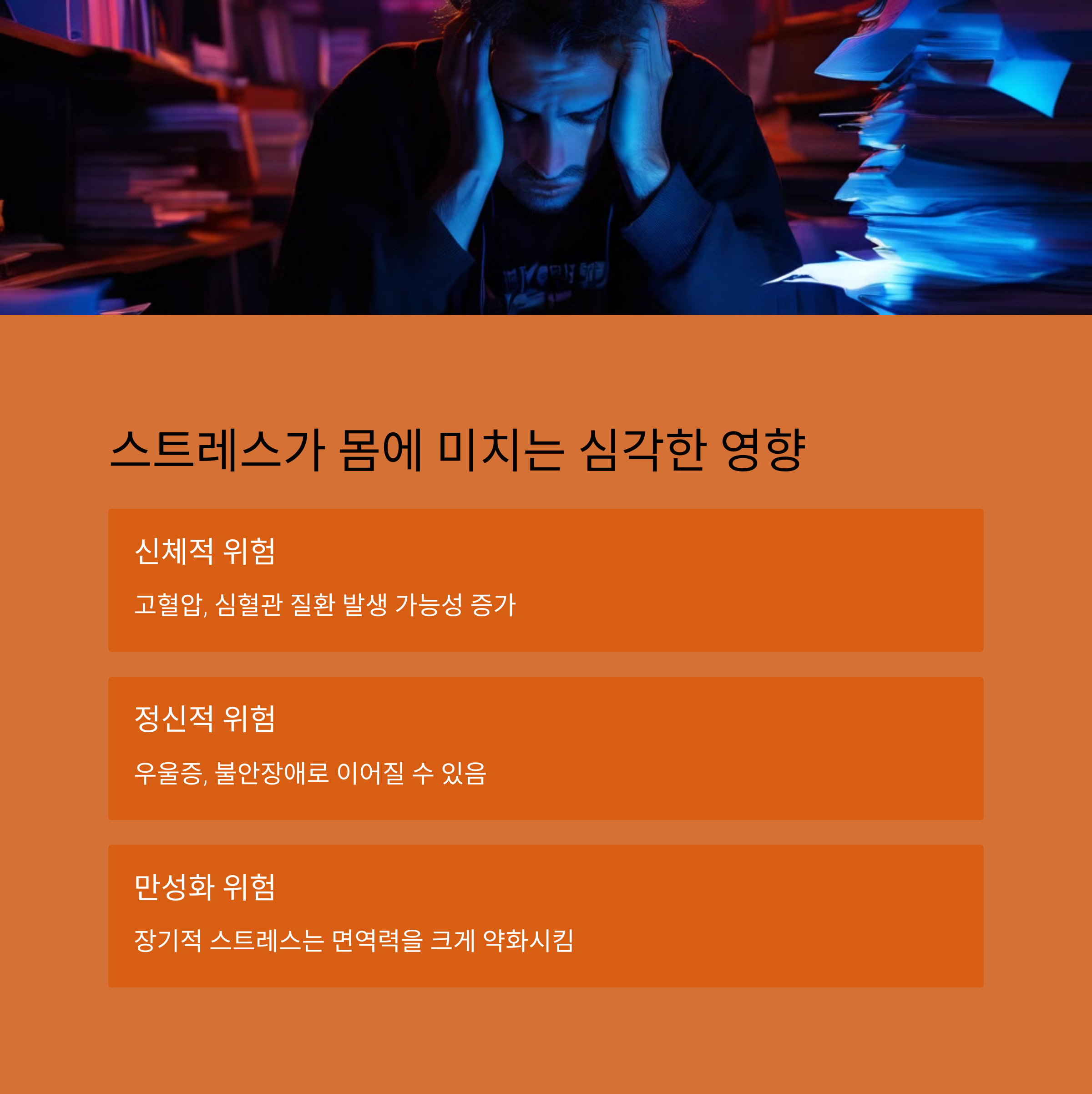 스트레스는 단순히 정신적인 문제로 끝나는 것이 아니다. 장기간 지속될 경우, 신체적 질병으로 이어질 수 있다. 대표적으로 고혈압, 심혈관 질환, 면역력 저하, 소화기 문제 등이 발생할 수 있으며, 심할 경우 우울증과 불안장애로 이어질 수도 있다.