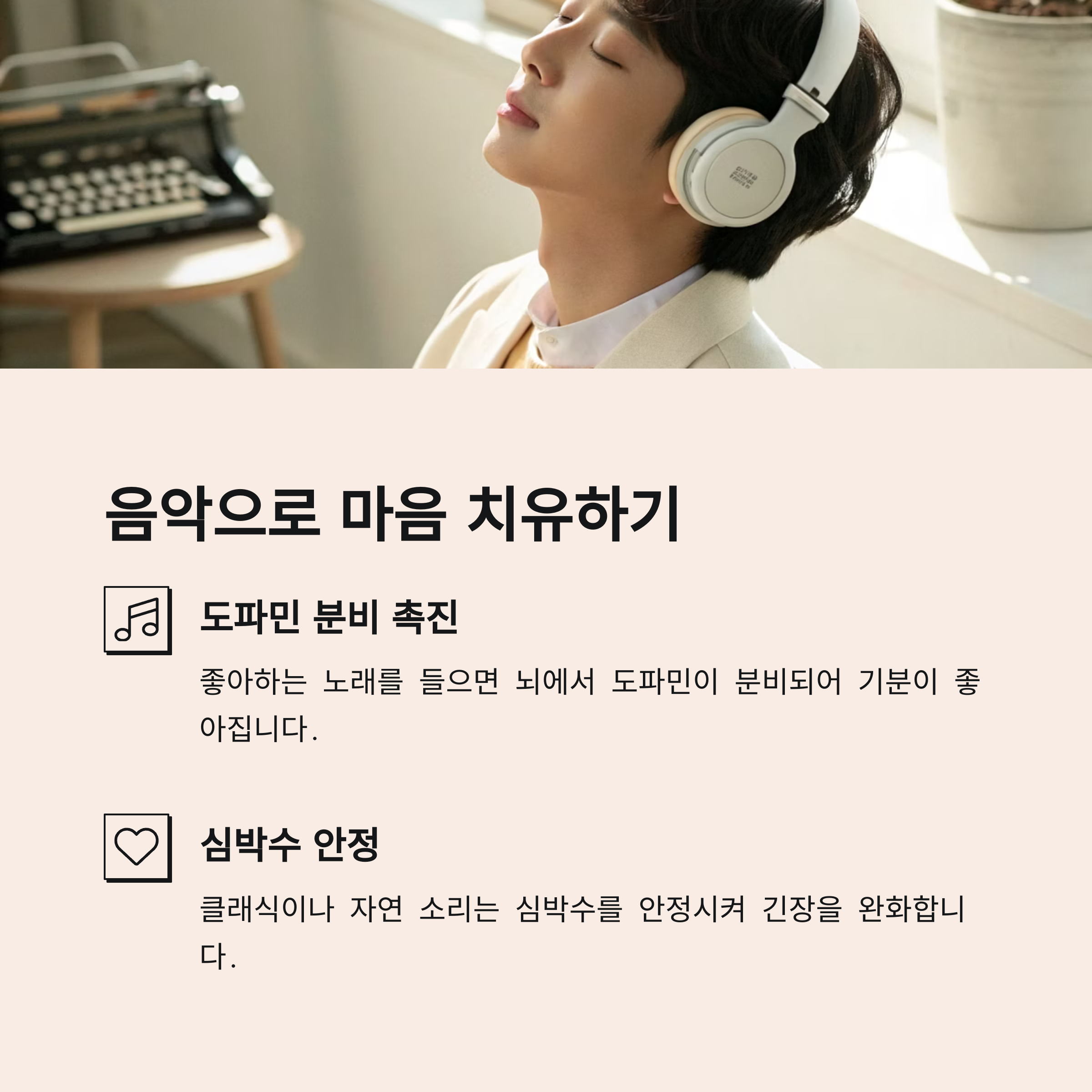 • 특히 클래식이나 자연 소리는 심박수를 안정시켜 긴장을 완화합니다.