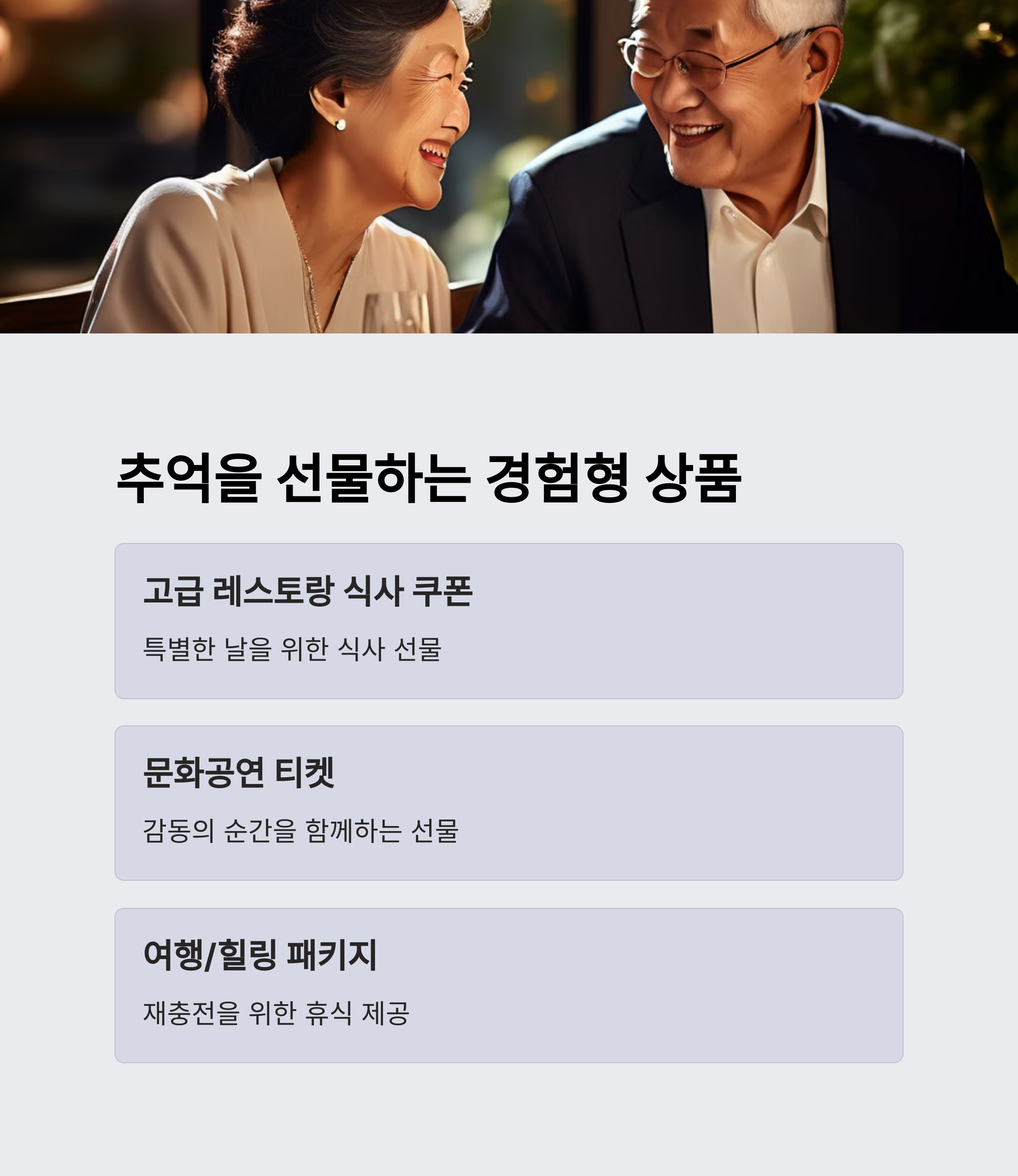선물은 물건만이 전부는 아니에요. 기억에 남는 ‘경험’을 선물하는 것도 아주 멋진 선택이에요. 요즘은 부모님께 특별한 하루를 만들어드릴 수 있는 경험형 선물이 정말 인기가 많아요!