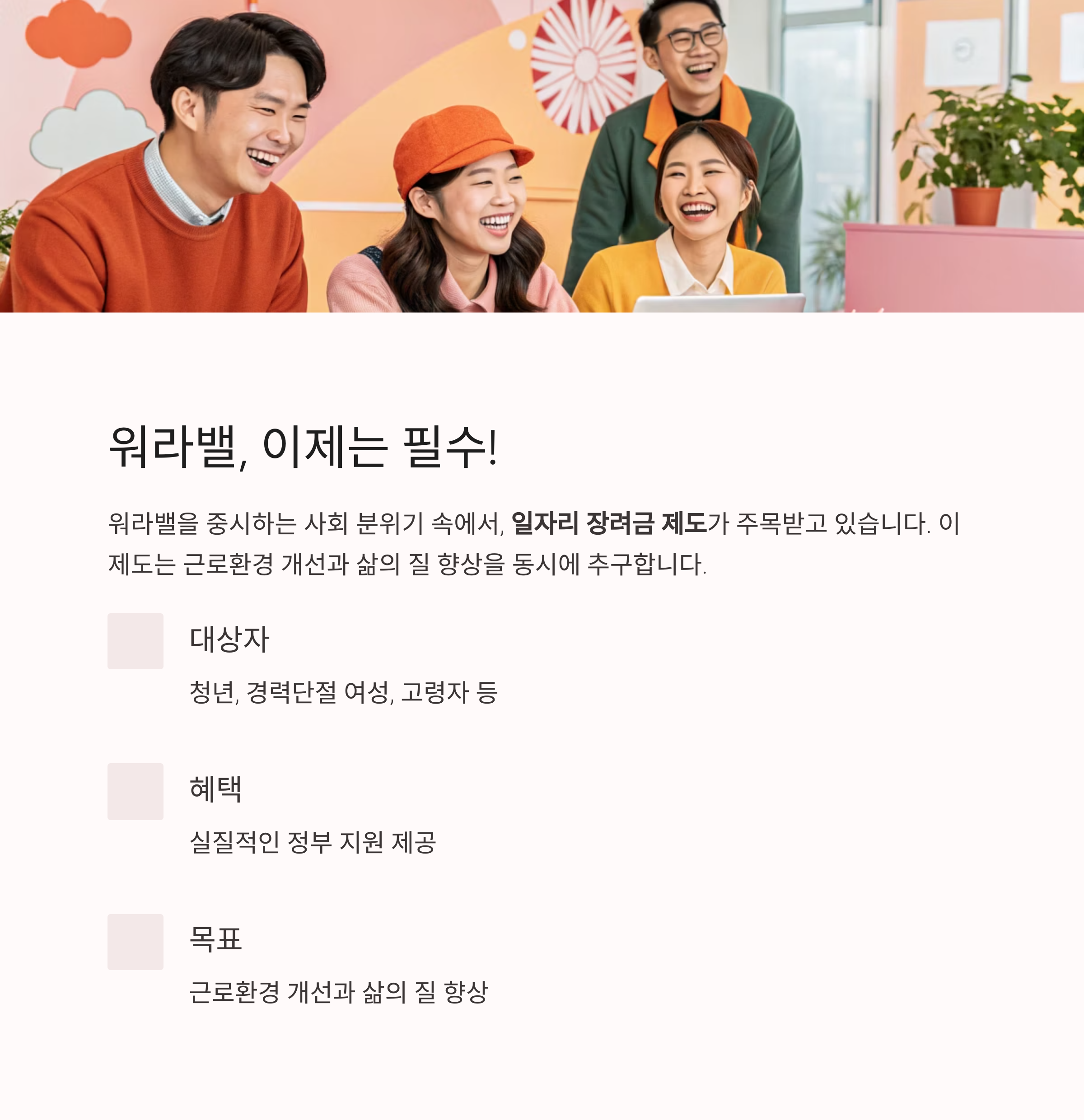 워라밸(Work-Life Balance)을 중시하는 사회 분위기 속에서, 중소기업과 근로자 모두에게 도움이 되는 ‘일자리 장려금 제도’가 주목받고 있습니다.