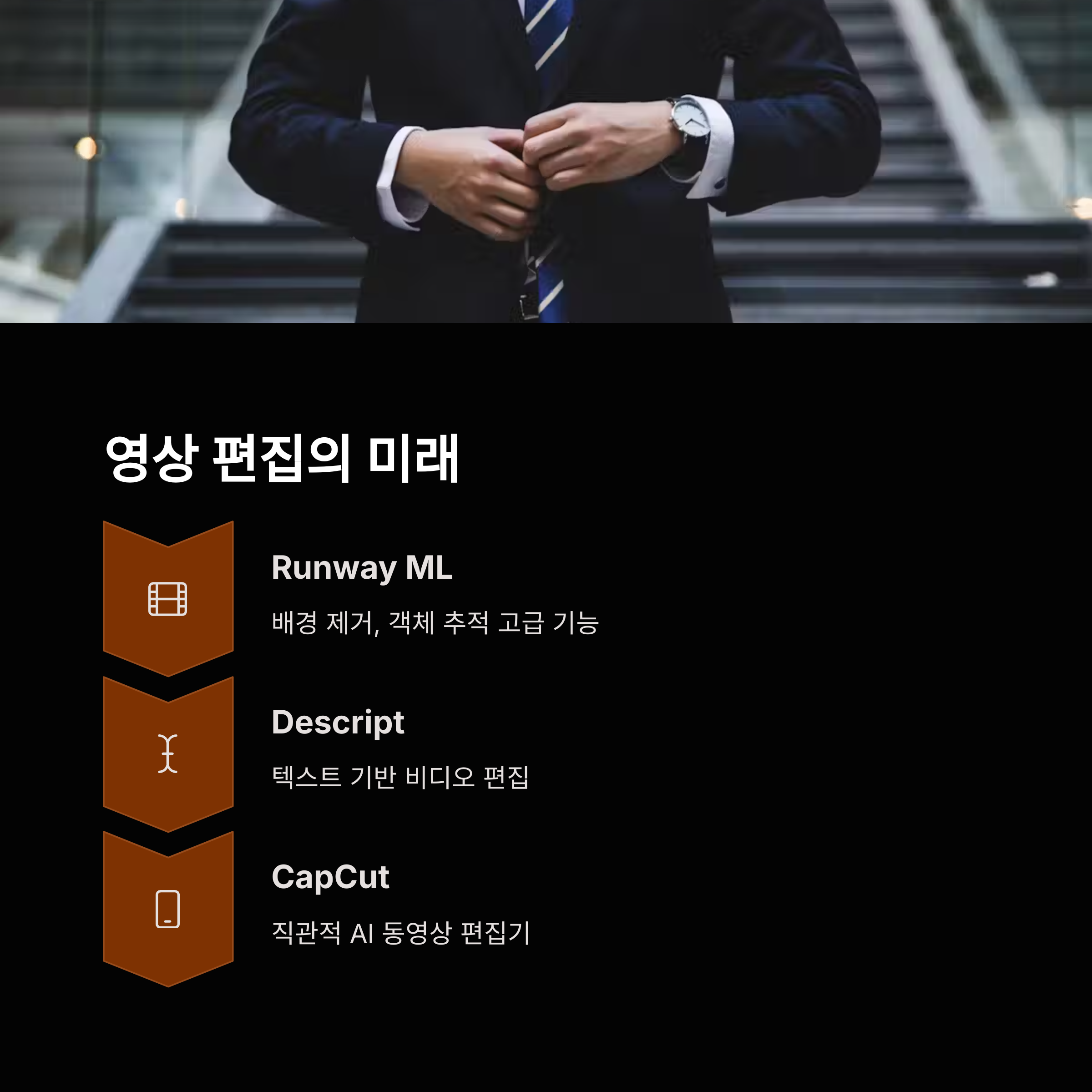 | 제품 광고 영상 | Runway, Descript, Veed.io | 장면 생성 → 나레이션 삽입 → 편집 |