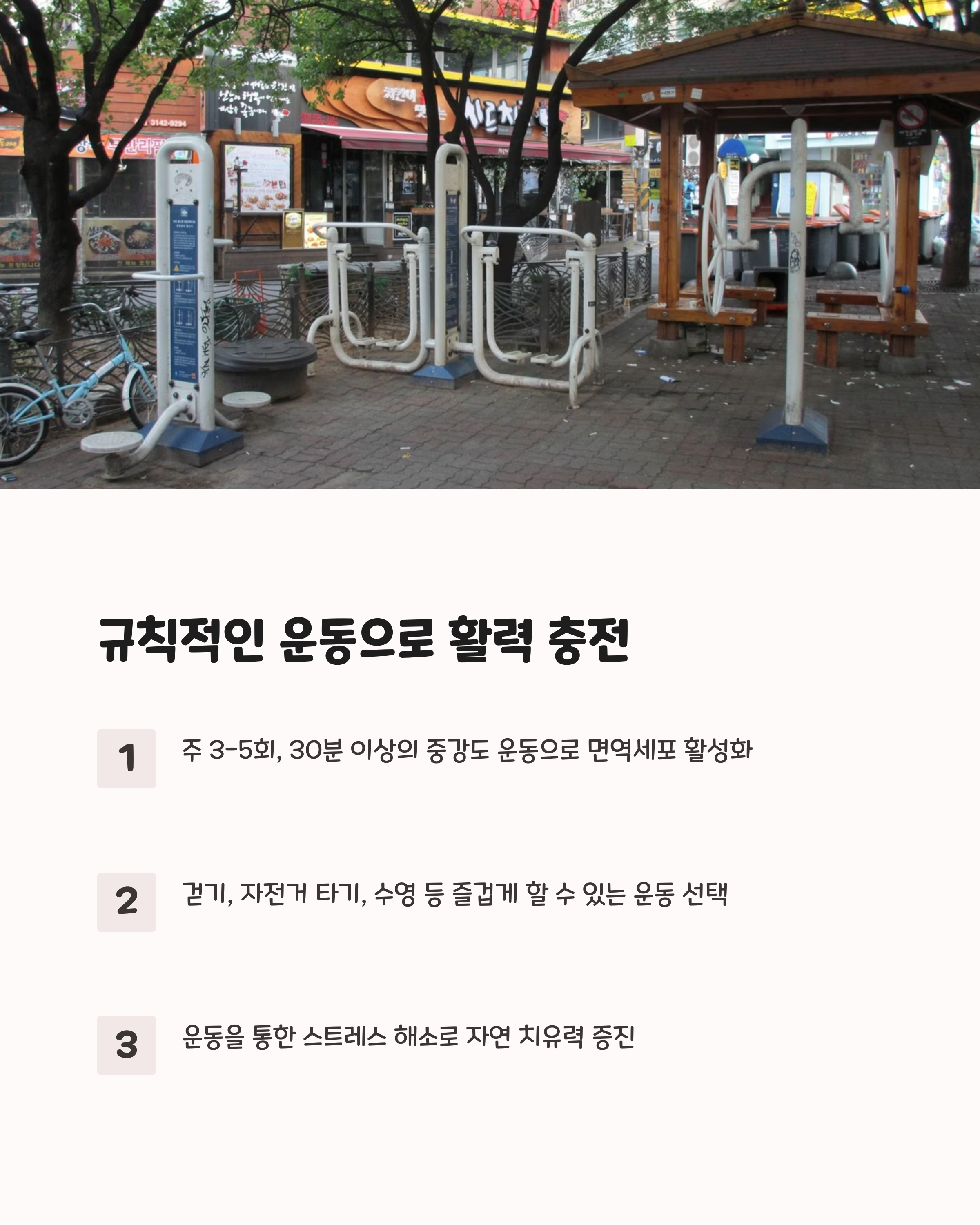 규칙적인 운동도 면역력을 높이는 중요한 요소입니다. 과하지 않은 유산소 운동은 면역 세포를 활성화시키고 혈액순환을 개선하여 자연 치유력을 강화합니다. 하루 30분 이상 빠르게 걷거나 요가, 스트레칭 같은 가벼운 운동을 꾸준히 실천하면 몸의 면역 체계가 한층 더 건강해집니다. 그러나 과도한 운동은 오히려 면역 기능을 저하시킬 수 있으니 자신의 체력에 맞는 운동을 선택하는 것이 중요합니다.