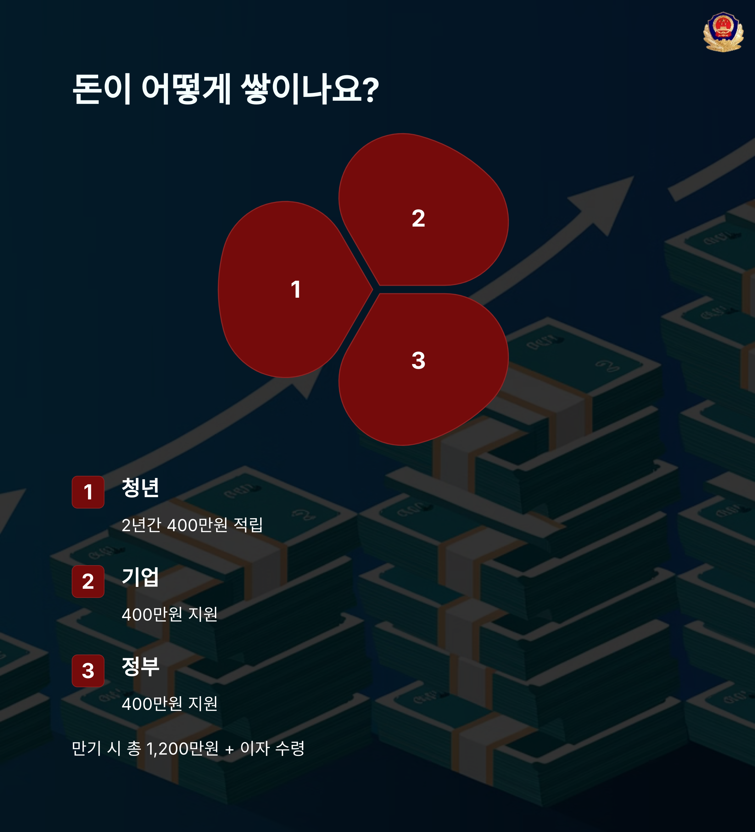 즉, 2년 동안 본인이 300만 원을 납입하면 기업과 정부가 추가 지원해 1,200만 원 이상을 수령할 수 있습니다.