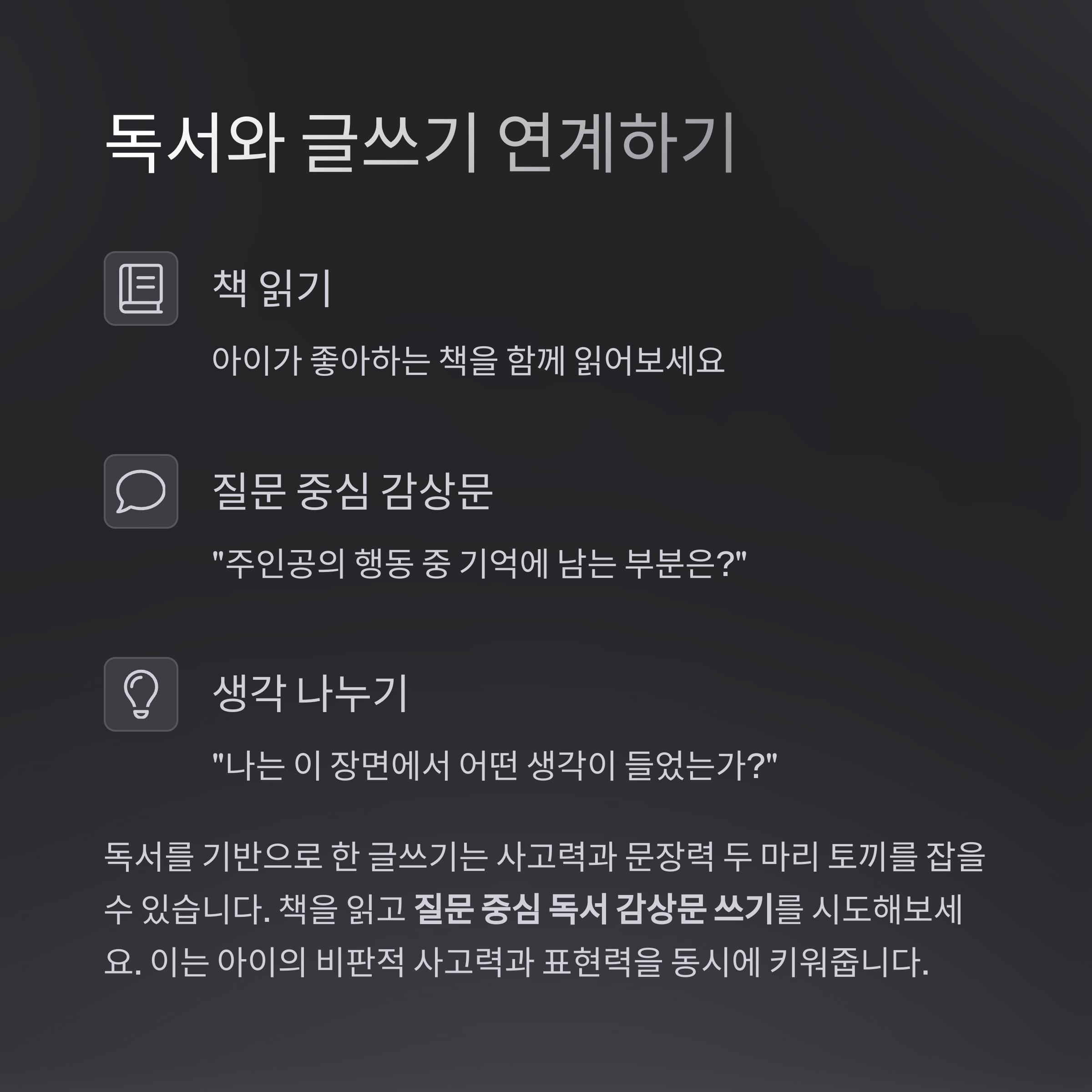 하지만 막연한 글쓰기 훈련은 아이에게 부담만 줄 수 있기 때문에 단계적으로 흥미를 유도하고 자신감을 심어주는 방식이 중요합니다.