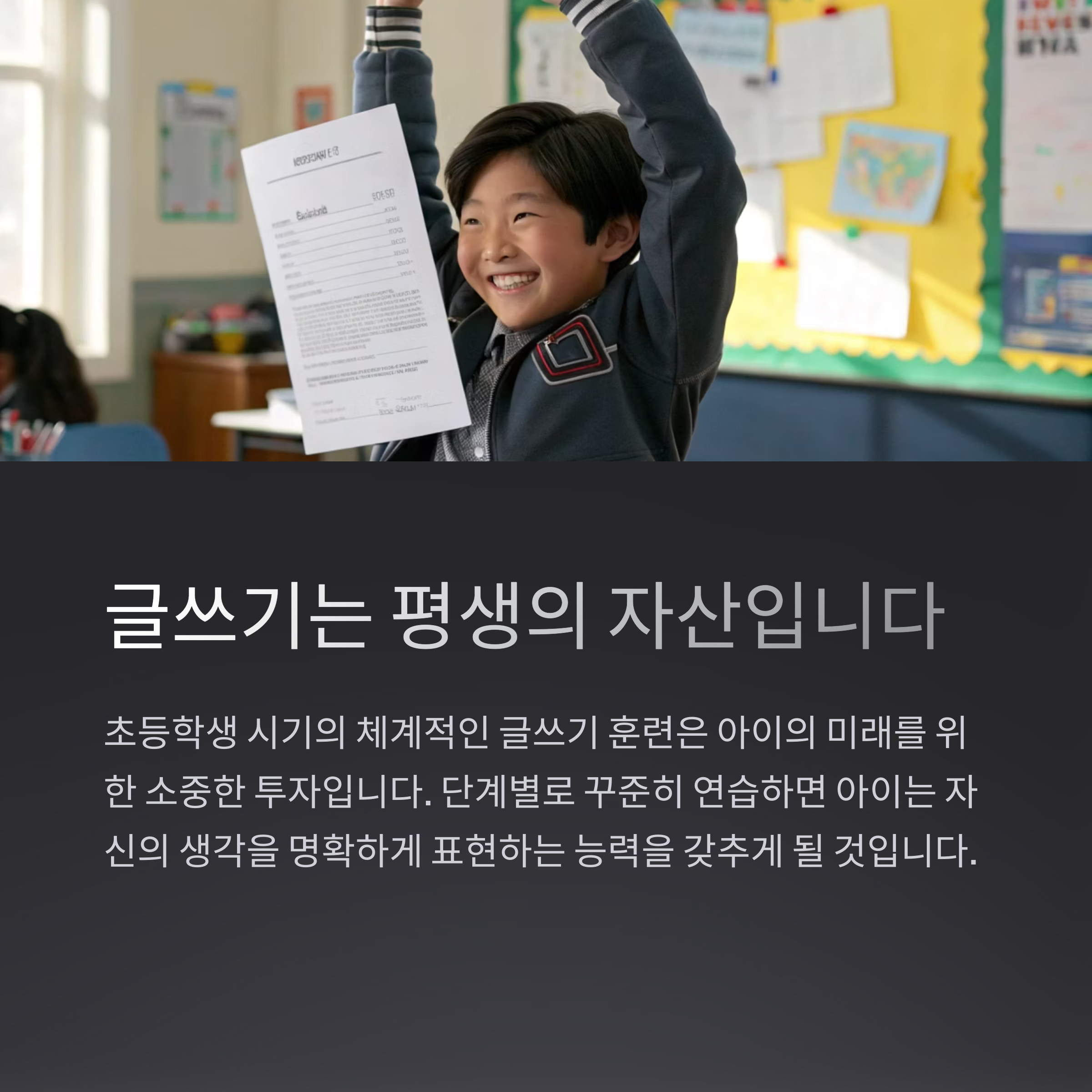 초등학생의 글쓰기 능력은 단순한 작문 능력을 넘어 사고력과 표현력, 독해력까지 영향을 미칩니다.