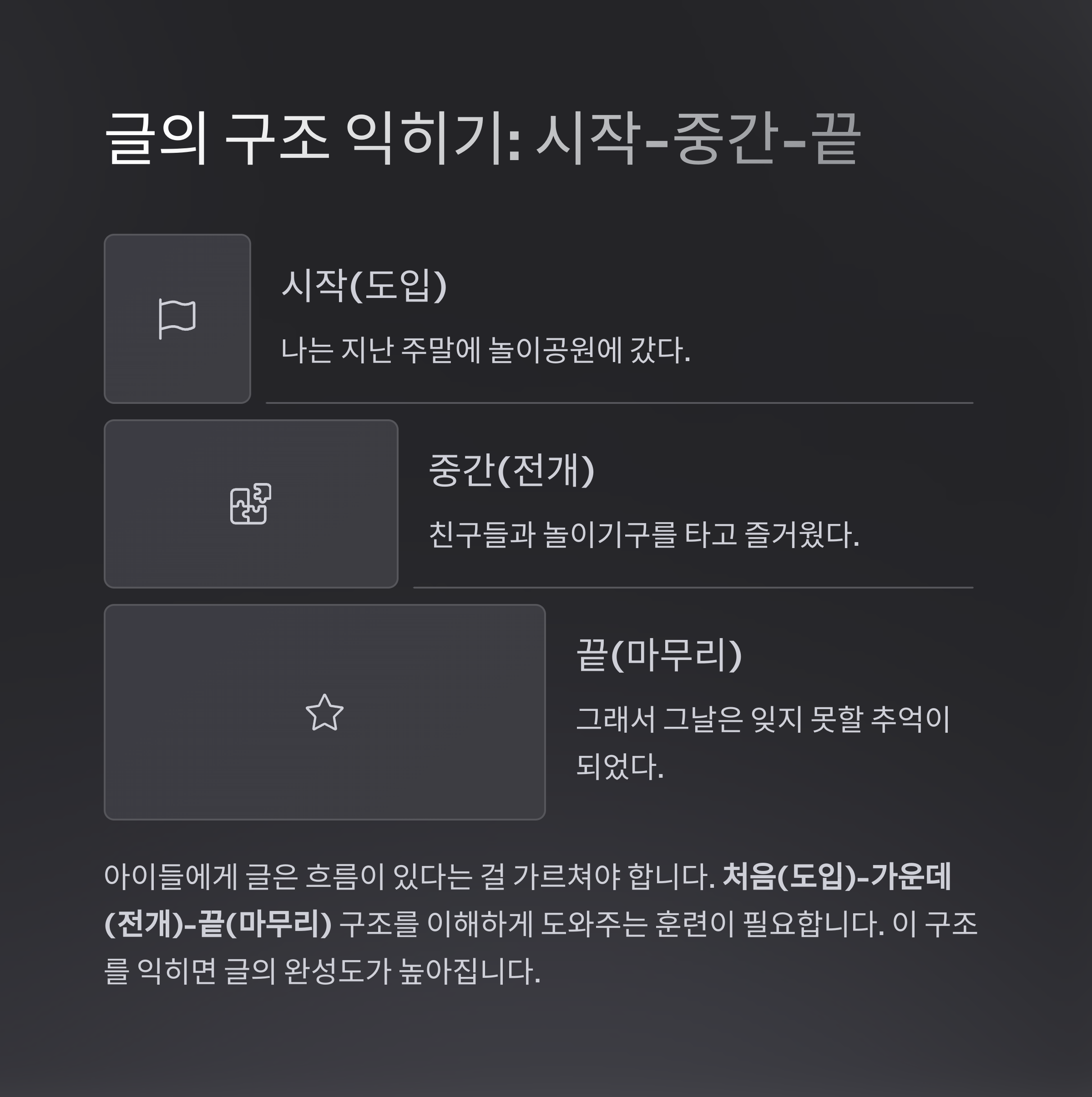 처음(도입)-가운데(전개)-끝(마무리) 구조를 이해하게 도와주는 훈련이 필요합니다.