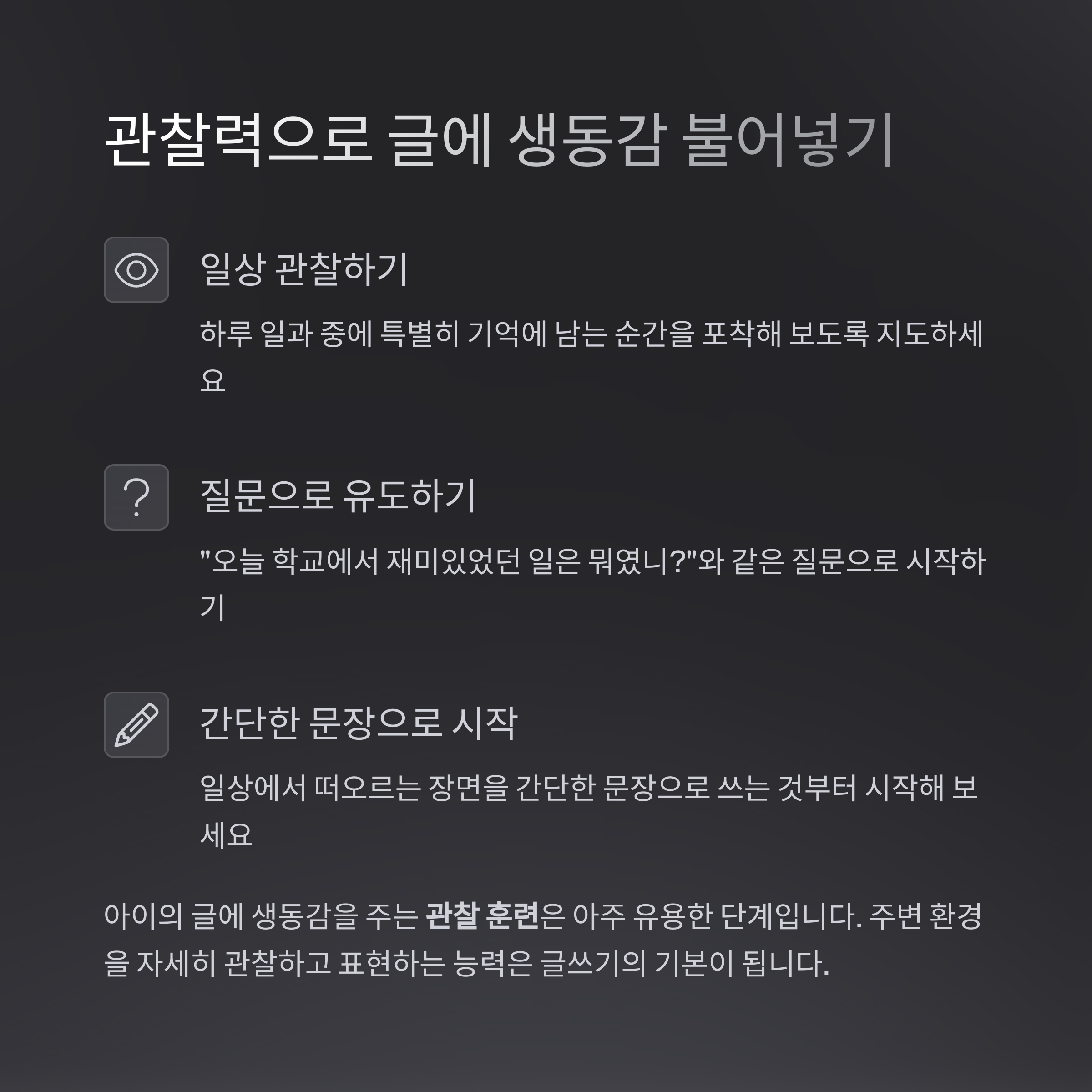 아이의 글에 생동감을 주는 관찰 훈련은 아주 유용한 단계입니다.