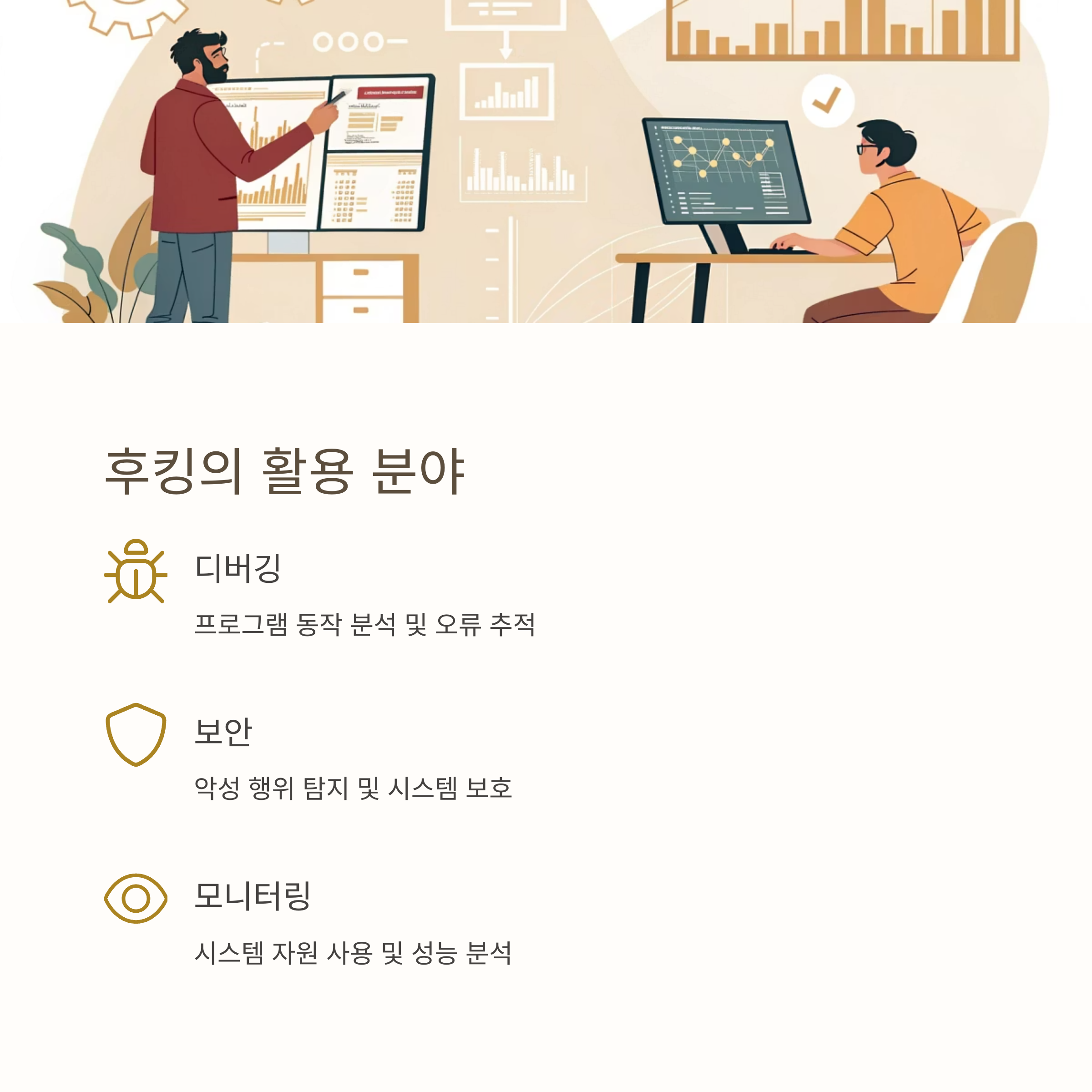 예를 들어, 디버깅 도구는 후킹을 통해 프로그램의 동작을 분석하고, 보안 소프트웨어는 후킹을 사용하여 악성 행위를 탐지합니다.