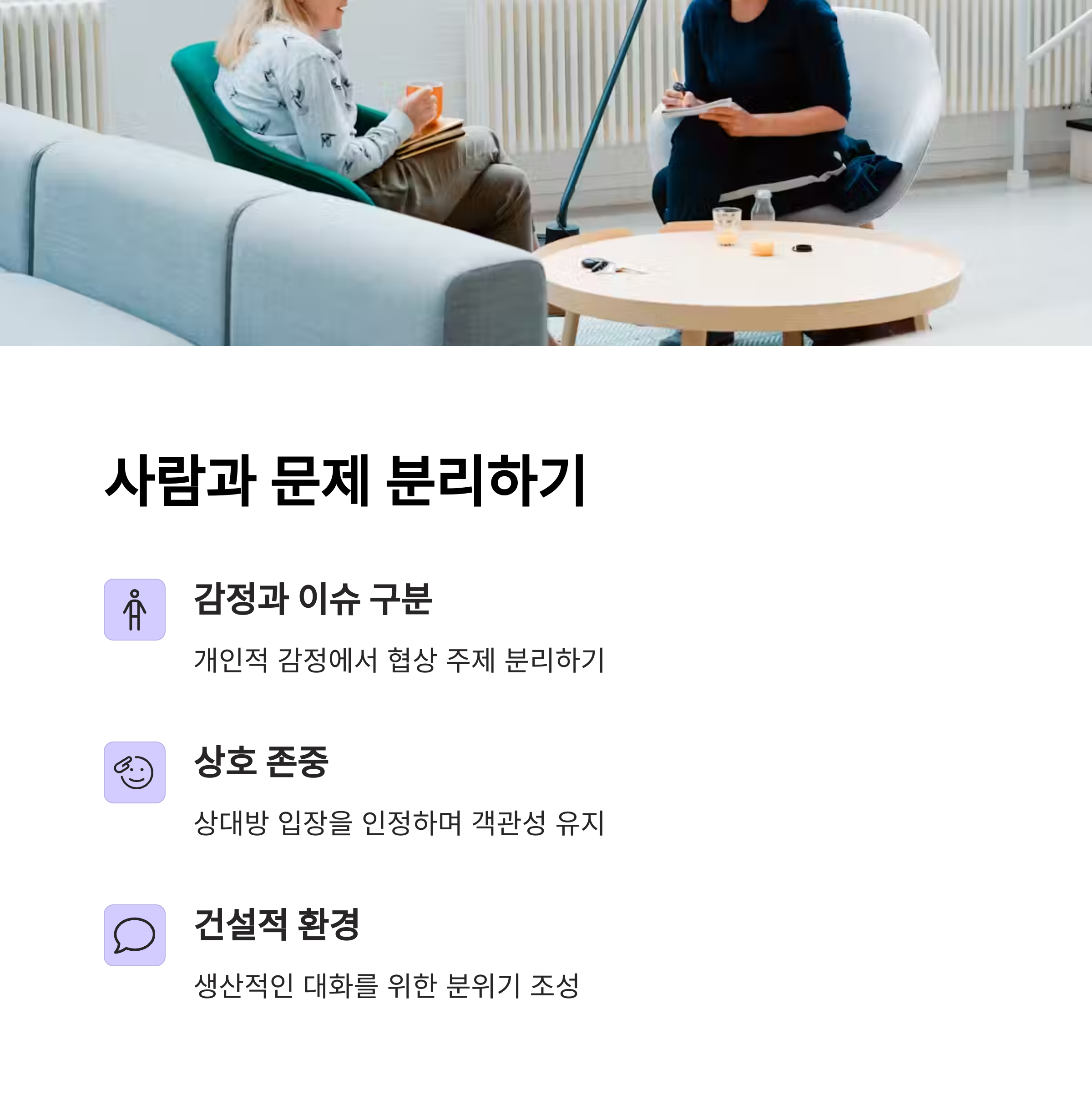 | 사람과 문제 분리 | 개인 감정과 이슈를 구분하여 감정적 충돌 방지 |