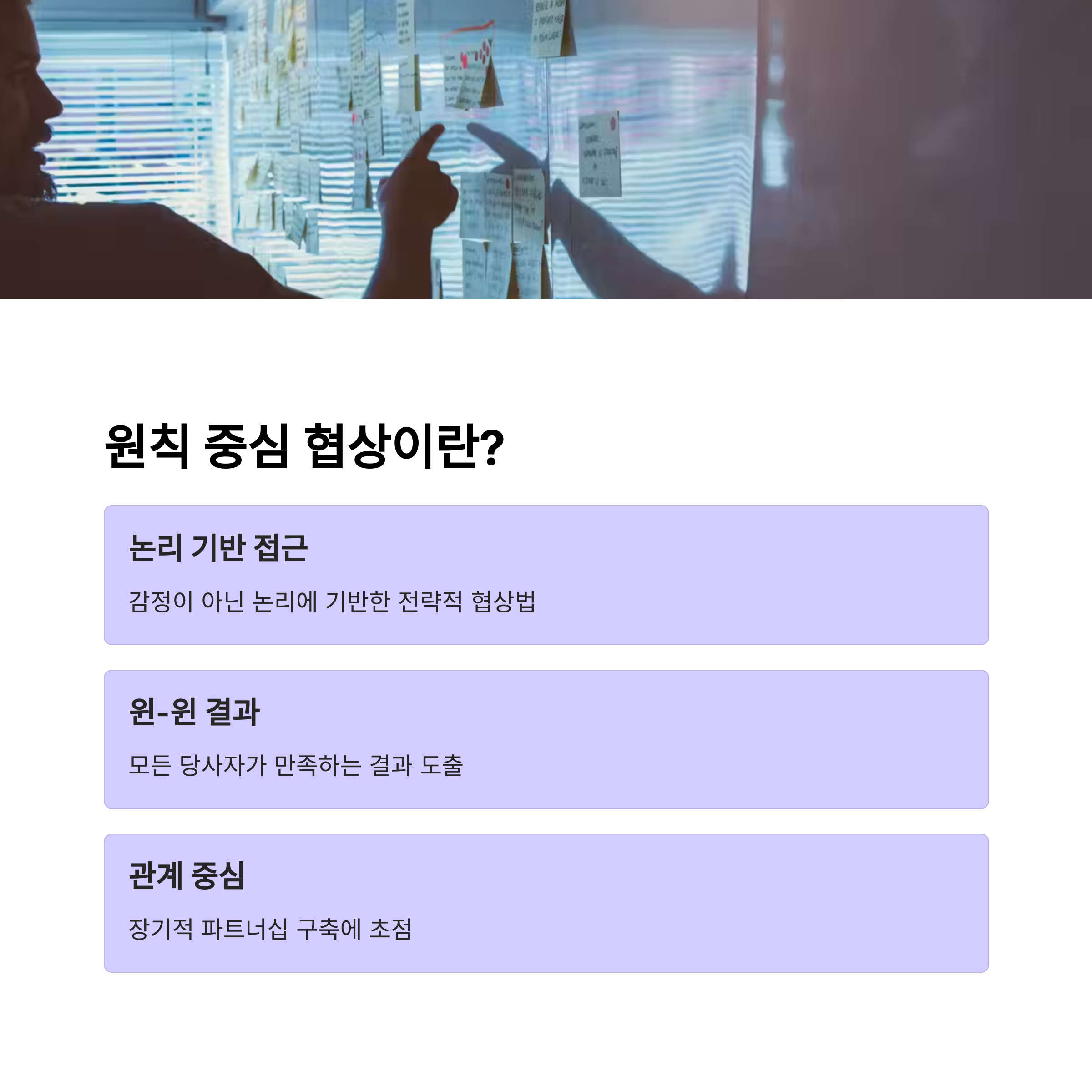 원칙 중심 협상이란 감정적 반응이나 힘의 우위가 아닌, 공정하고 객관적인 기준에 따라 협상을 이끌어가는 접근이에요. 로저 피셔와 윌리엄 유리는 "협상은 싸움이 아니라 문제 해결"이라고 강조해요.