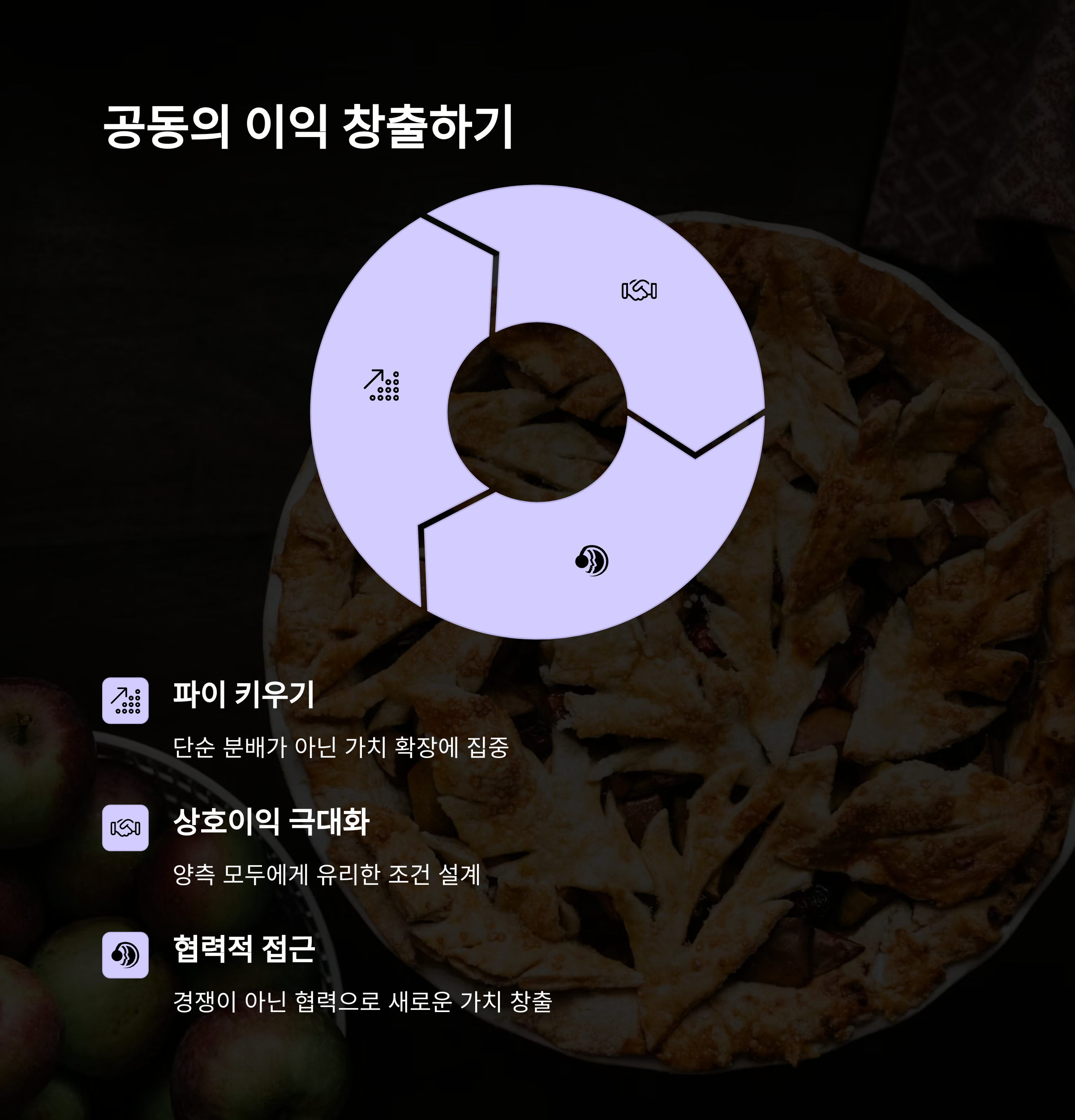 협상의 핵심은 '누가 더 많이 가져가느냐'가 아니라 '어떻게 하면 모두가 만족할 수 있을까'에 있어요. 『협상의 법칙』에서는 이 과정을 '공동의 이익 창출'이라고 설명해요. 즉, 한정된 파이를 나누는 것이 아니라 파이 자체를 키우는 접근이죠.