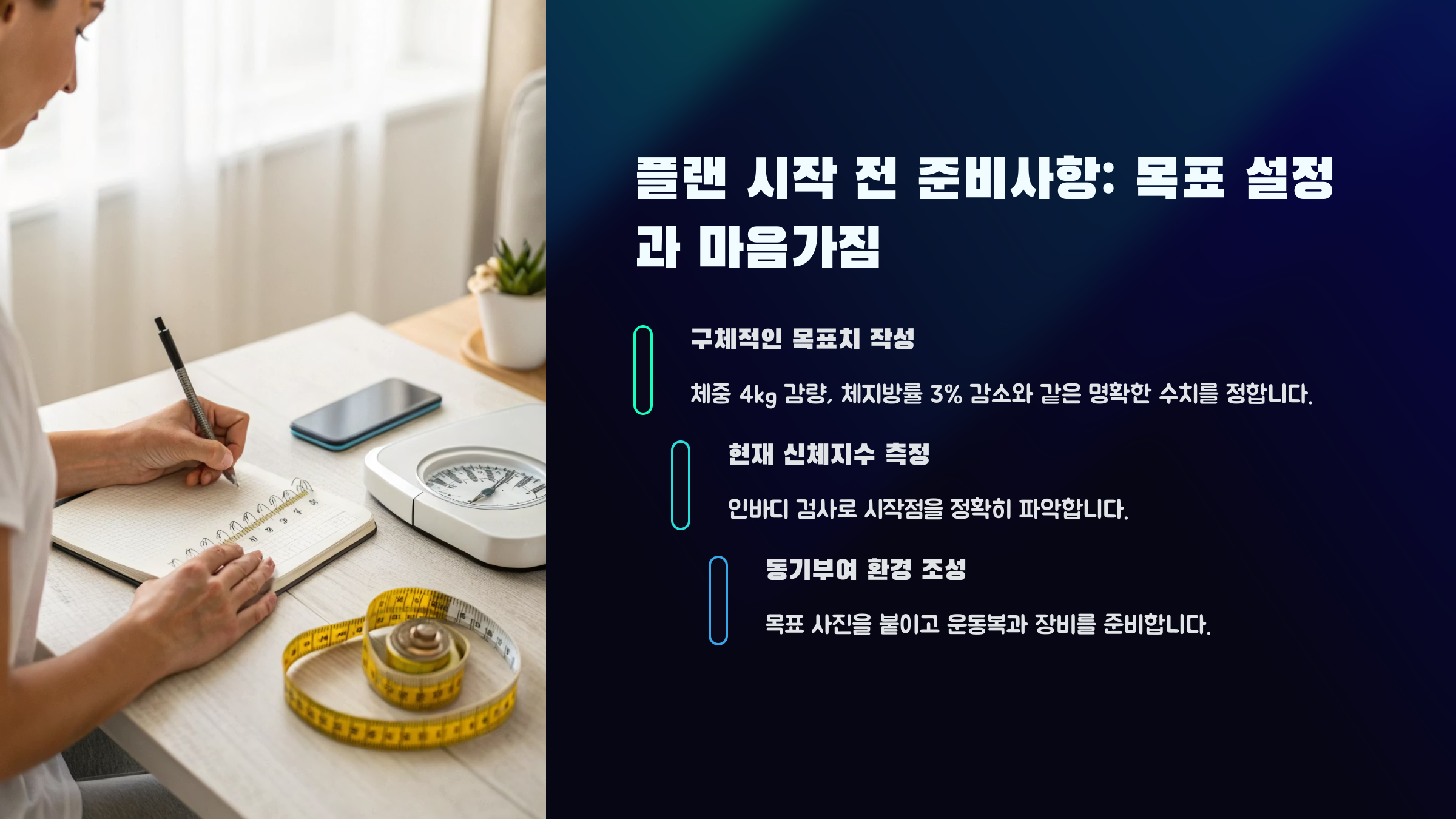 "몸무게, 체지방률, 건강 상태 등 구체적인 목표를 세우세요."