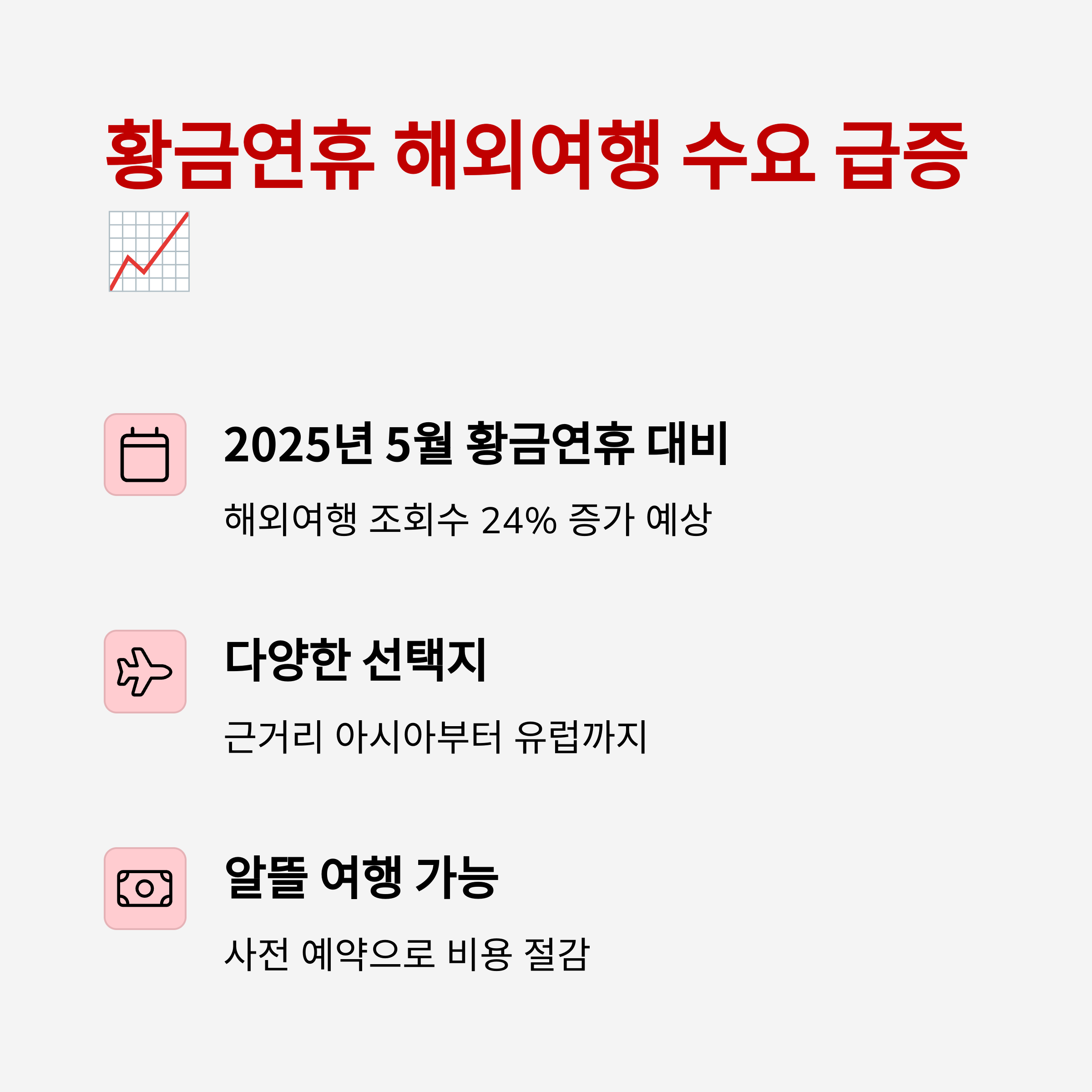 연차 하루만 잘 쓰면 5박 6일 여행도 가능하다는 점에서 많은 분들이 이번 연휴를 활용해 해외여행을 계획하고 있어요. 특히 올해는 코로나 이후 첫 완전한 개방 연휴라 수요가 폭발적으로 늘어난 상황이에요.