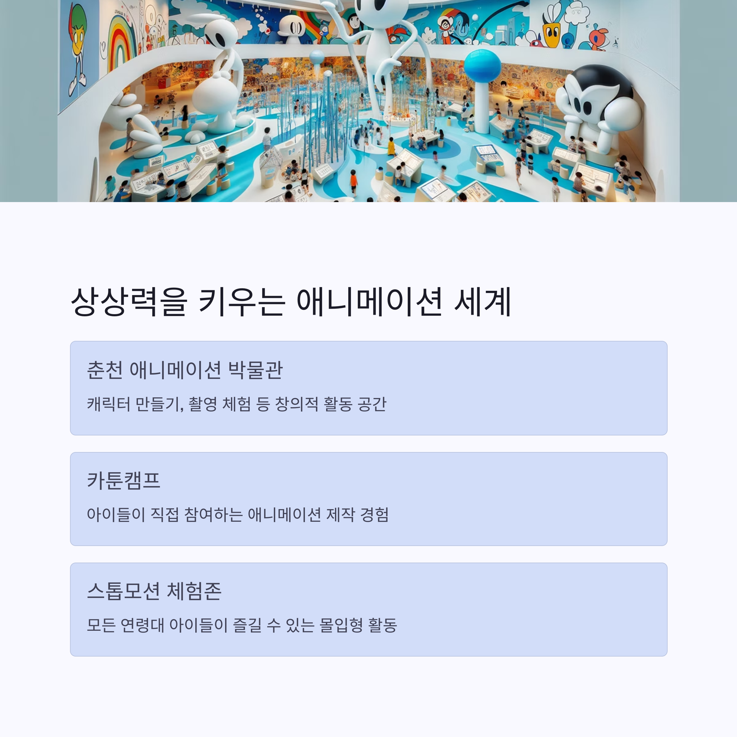 카툰캠프, 스톱모션 체험존 등 아이들이 몰입할 만한 요소가 가득합니다.
