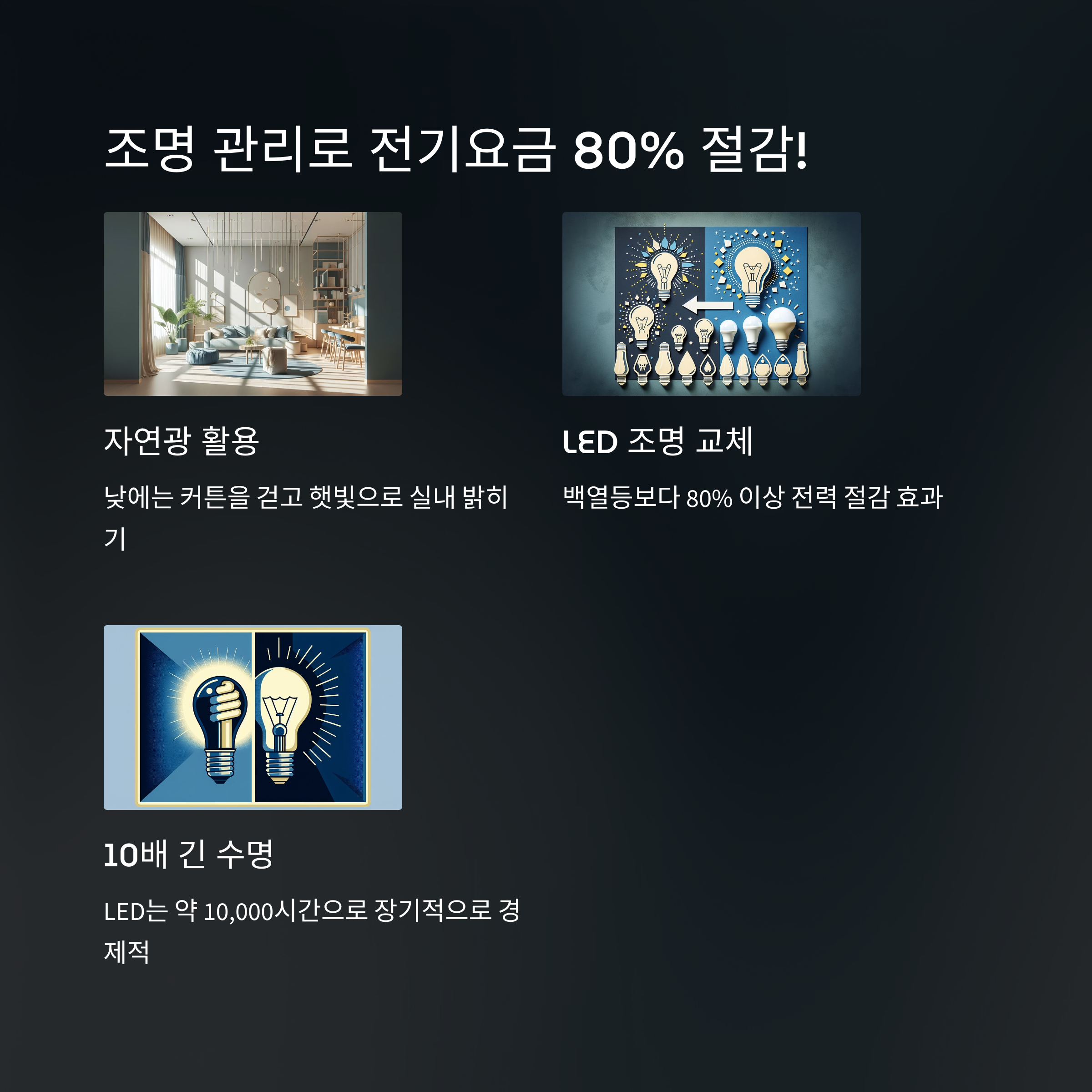 밤에는 기존 백열등 대신 LED 조명으로 교체하면 80% 이상의 전력 절감이 가능합니다.
