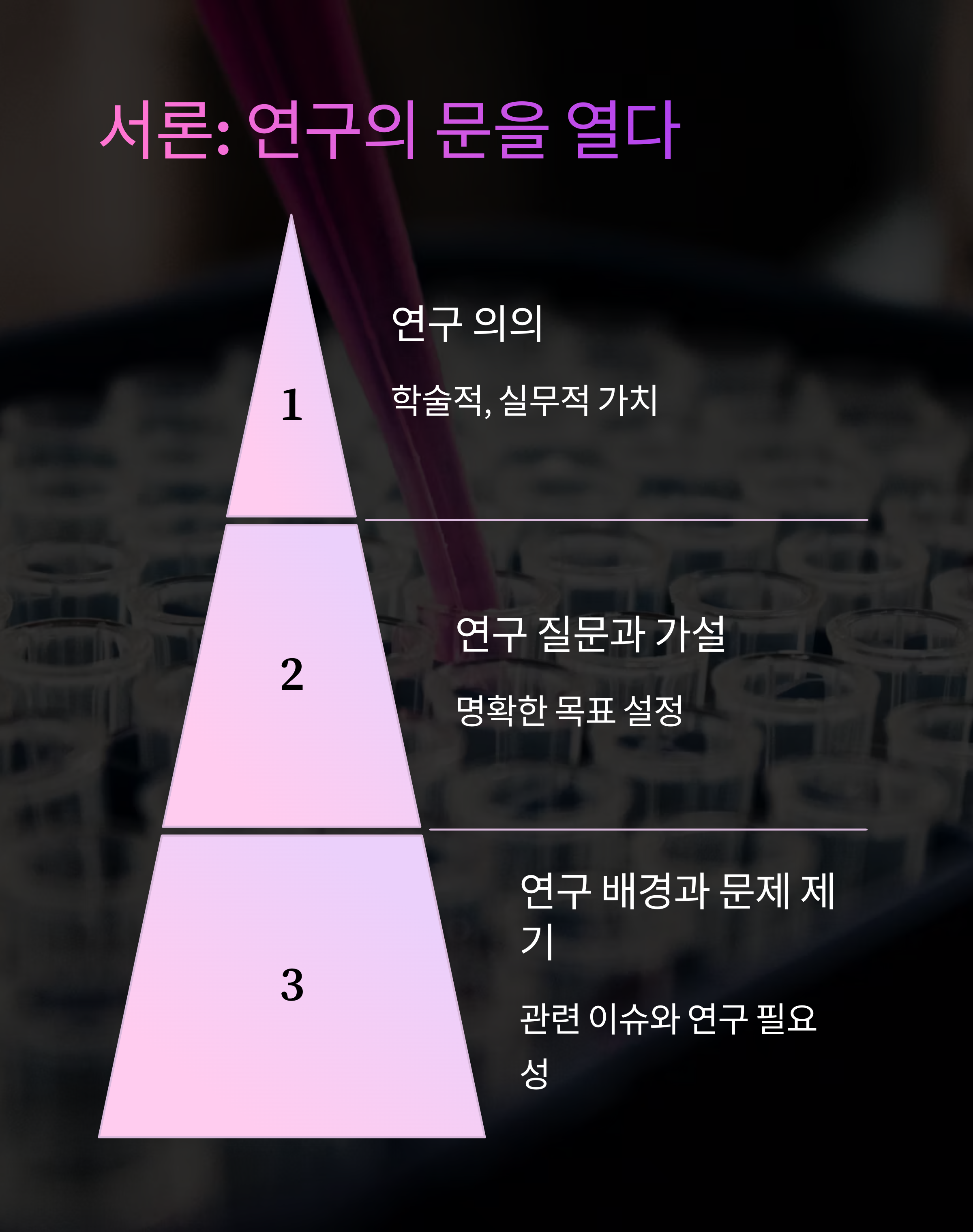 서론은 논문의 출발점이자, 독자가 ‘왜 이 논문을 읽어야 하는가’를 설득하는 중요한 파트예요. 이 부분에서 연구의 배경, 문제 제기, 목적, 구조를 제시하게 되죠. 즉, 독자가 논문 전체를 이해할 수 있도록 방향을 잡아주는 안내서 같은 역할을 해요.